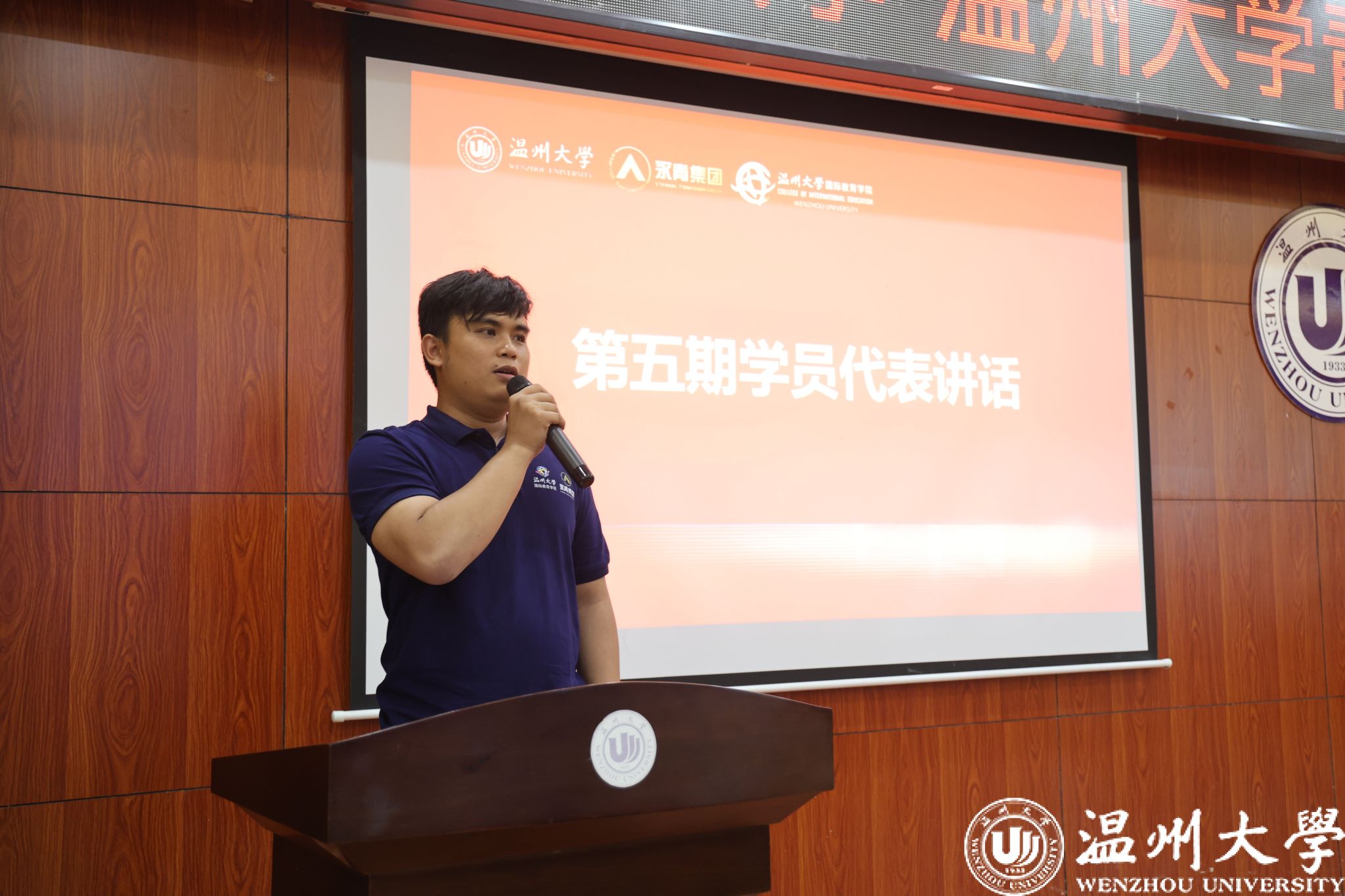 第五期学员代表安迪卡在发言中表达了对青山实业和小宝影院 的诚挚感谢。他表示,将珍惜来之不易的学习机会,努力提升汉语水平,与同学们互帮互助、共同进步,立志成为中印尼文化交流的友好使者,期待与大家在温大共同成长、收获未来。