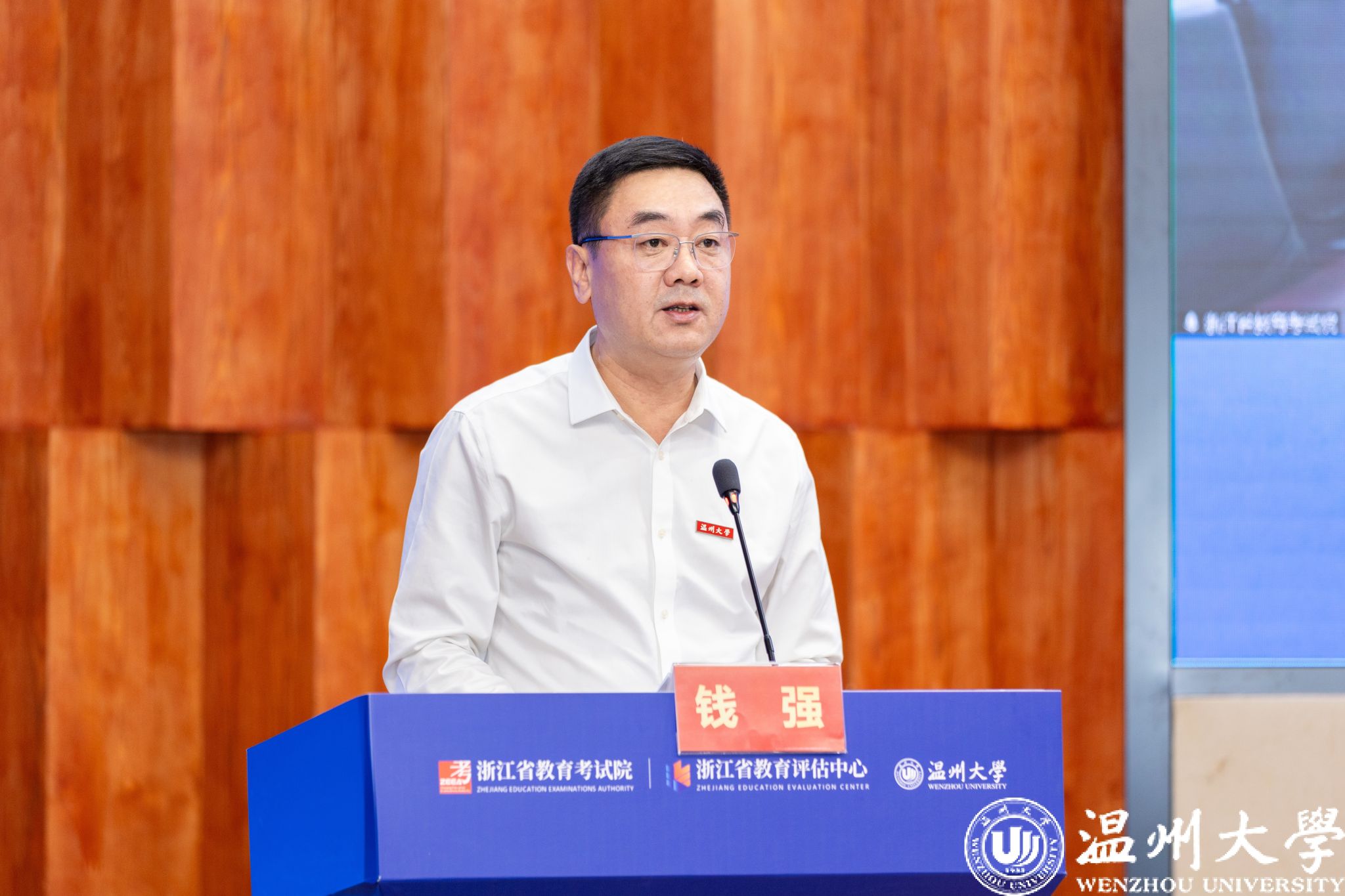 校党委书记钱强致辞并表态。在致辞中,钱强回顾了学校的办学历程,介绍了学校近年来在人才培养、学科专业建设、科技创新、服务地方发展等方面的办学成效。他强调,本科审核评估是对学校本科教育教学工作全面系统的把脉诊断,是对“为党育人、为国育才”成效的一次集中检验,更是学校锚定“建设浙江省高水平大学、争创‘双一流’”目标,补齐短板、锻造长板的重大助力和宝贵契机。他代表学校表态,将以高度的责任感与使命感,全力保障评估流程顺畅高效。学校将坚持“实事求是、不避短板”的原则全面呈现办学真实面貌,让专家全方位、深层次了解学校办学的实际情况;将虚心求教、全面吸纳各位专家的宝贵意见,以“钉钉子精神”推动整改落地;将以评促建谋发展,把评估成效转化为发展动能,持续深化教育教学改革。真诚希望通过专家组的精准把脉,帮助学校找准问题根源、明确改进方向,推动学校本科教育教学工作再上新台阶。