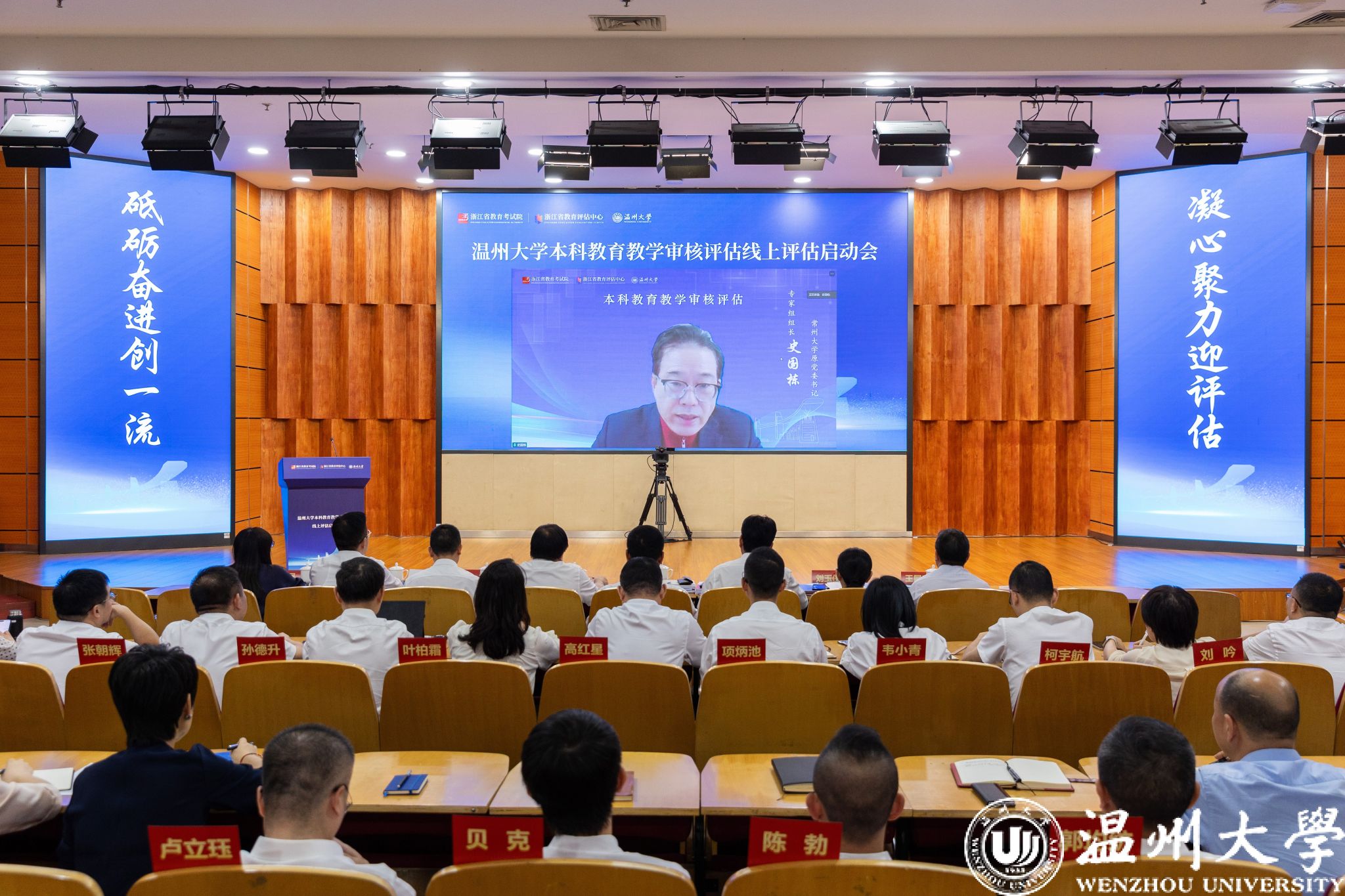 审核评估专家组组长、常州大学原党委书记史国栋,副组长、杭州师范大学正校级领导、丽水学院原党委书记王利琳,专家组全体成员和项目管理秘书组,浙江省教育考试院党委委员、院长徐继彬,浙江省教育厅高等教育处二级调研员王国银,浙江省教育考试院研究室副主任、浙江省教育评估中心高教研究所所长林瑞玉,小宝影院 党委书记钱强、校长赵敏等全体校领导、中层干部、教学督导代表、师生代表参加会议。会议由林瑞玉主持。