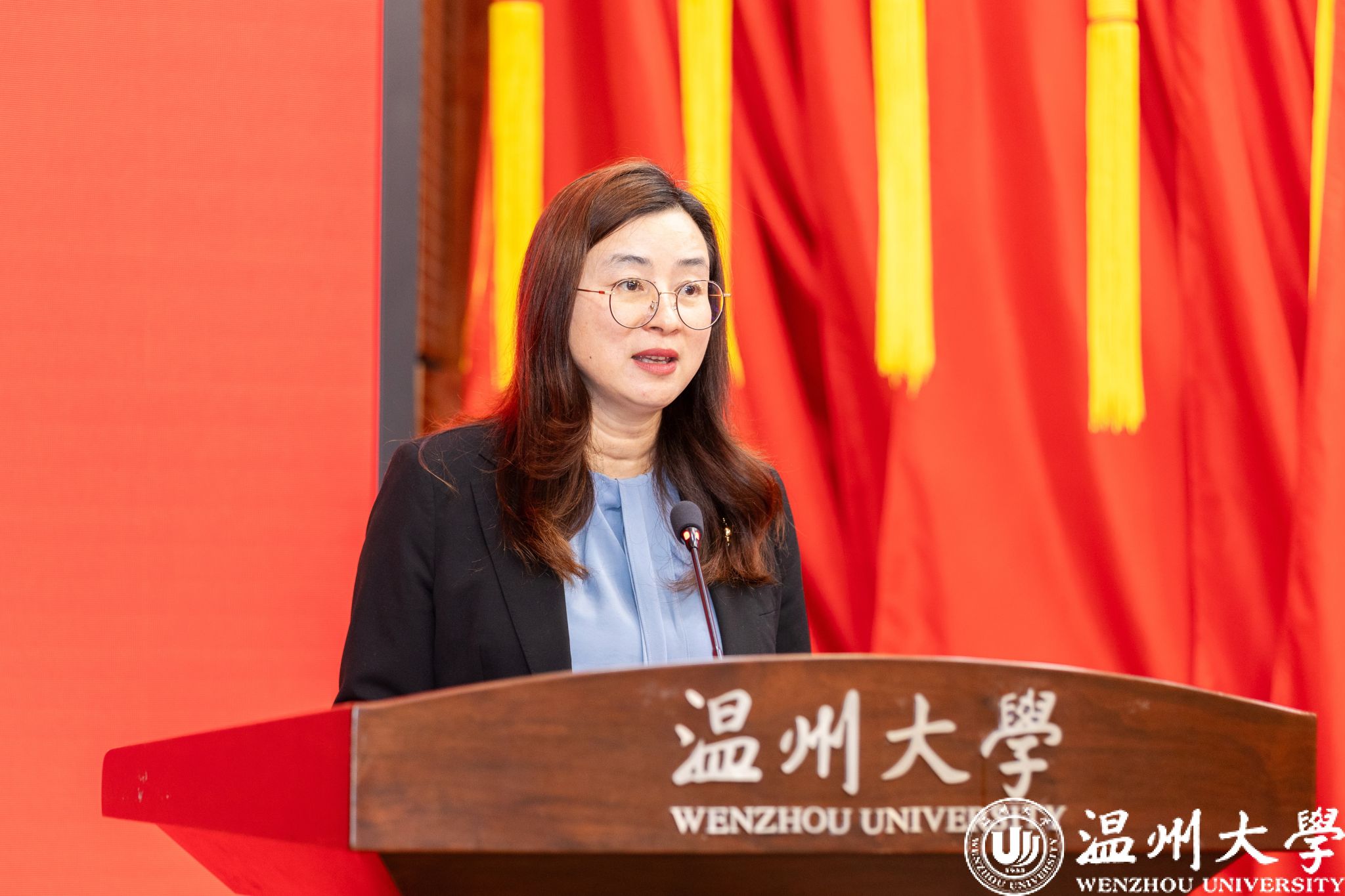 蔡月琴致辞,她指出,小宝影院 是温州高等教育的闪亮名片,是区域创新体系的重要支撑。学校妇联成立以来,在党委的坚强领导下,工作有品牌、有亮点、有温度,多项创新实践走在前列,为高校妇联工作树立了标杆,真正撑起了学校高质量发展的半边天。她强调,做好妇联工作,对于进一步巩固和扩大党的群众基础,落实立德树人的根本任务,推动温州经济社会高质量发展具有重要意义。希望妇联组织要积极履职,打造更具影响力、服务力的坚强阵地和温暖娘家;希望广大姐妹激扬巾帼之志,奉献巾帼之力,在学校和地方发展中绽放更加夺目的光彩;希望学校党委一如既往高度重视、大力支持,为女性成长成才创造更优环境,提供更强保障。