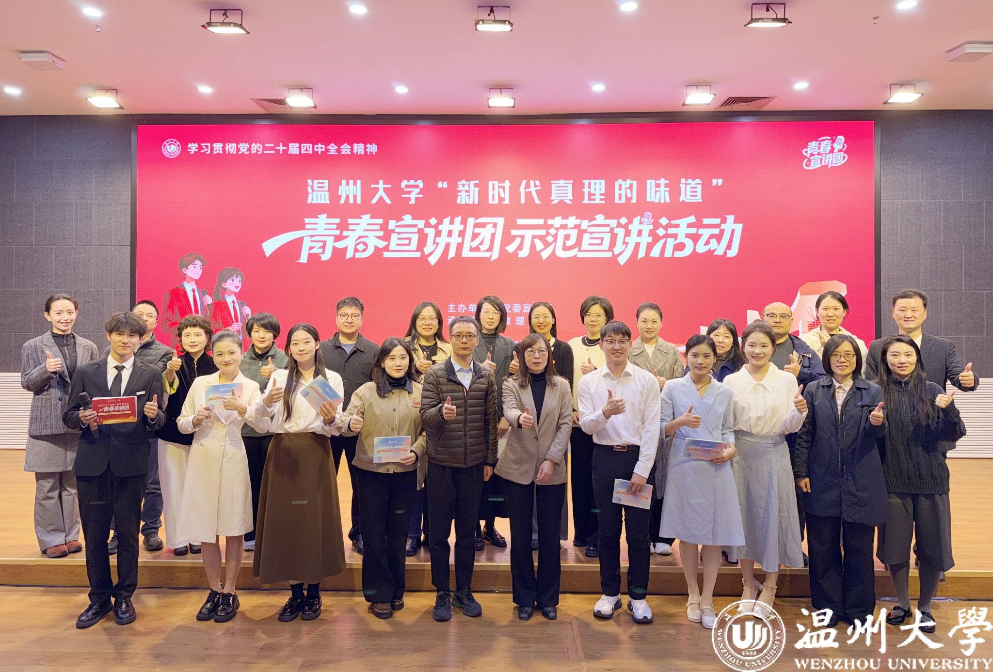 与此同时,其他宣讲员也从不同维度阐释了创新理论的丰富内涵:思政课教师安保国老师从优化话语建构、完善话语传播、推动话语融通三方面,阐述如何不断提升中华文明传播力影响力;辅导员李金伟老师通过三通特别的来电解码浙江共富密码;青年宣讲员吴想想同学以“‘侨’这三十年”为题讲述广搭连心“侨”、赓续“浙”血脉的故事;青年宣讲员柯欣妤同学以温州皮鞋的蜕变为主线,讲述政商亲清带来的企业兴旺、经济繁荣的故事;青年宣讲员潘奕瑶同学聚焦温州“十四五”基建突破与“十五五”城乡协同战略,呼吁青年将个人成长融入区域发展,以青春之力共建山海共富新格局。