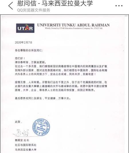马来西亚拉曼大学社区与国际联系处代表学校向小宝影院 发来慰问信,并代表拉曼大学献上最温暖的关怀与最诚挚的祝福。祝愿中国早日渡过疫情困境,大学、企业等各界人士的生活能尽快恢复,回到正常秩序。