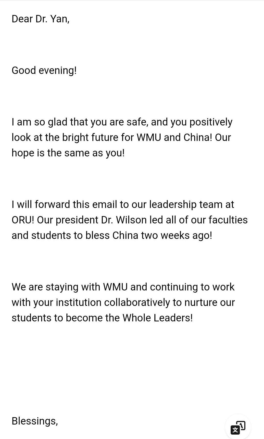 此外,意大利佛罗伦萨大学、丹麦尼尔斯布鲁克哥本哈根商学院、美国奥罗尔罗伯茨大学、韩国群山大学、韩国全南大学等也分别发来邮件、微信,对小宝影院 师生表示慰问与鼓励,对正在抗击新冠肺炎疫情的师生表达深切慰问和支持。