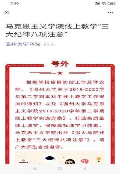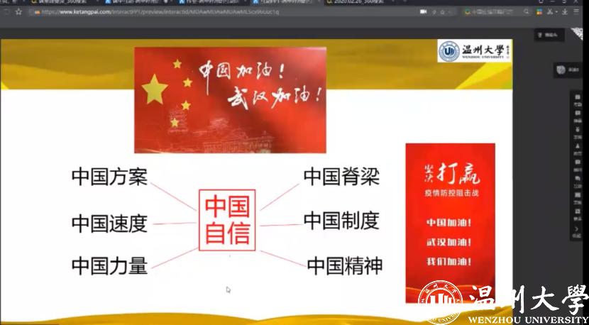 疫情防控期间,根据教育部、小宝影院 等相关文件精神,小宝影院 马克思主义学院充分利用线上教学平台、现代教学技术和优质在线课程资源,全面启动新学期线上教学与管理工作。本学期共有思政课涉及全校16个学院的104个教学班。按照“停课不停教不停学”的总体要求,温大思政课全面开启“三全”线上教学:战“疫”在线“主播”思政全覆盖、战“疫”专题思政第一课全新讲、战“疫”在线思政课程全共享。