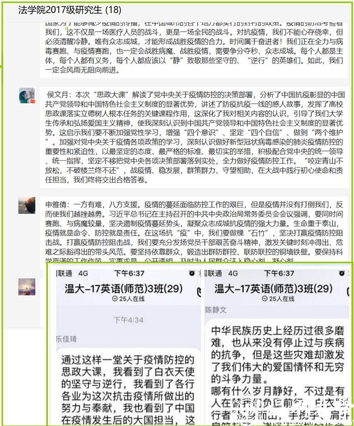 “听完思政大课,作为教师,我们要带领学生,在战疫关键时刻,怀揣一颗赤子之心,认真学习、积极服务,用万众一心、众志成城、滴水穿石的精神和实际行动来守护我们的家园。”外国语学院学生辅导员单伟乐在学习后谈到。