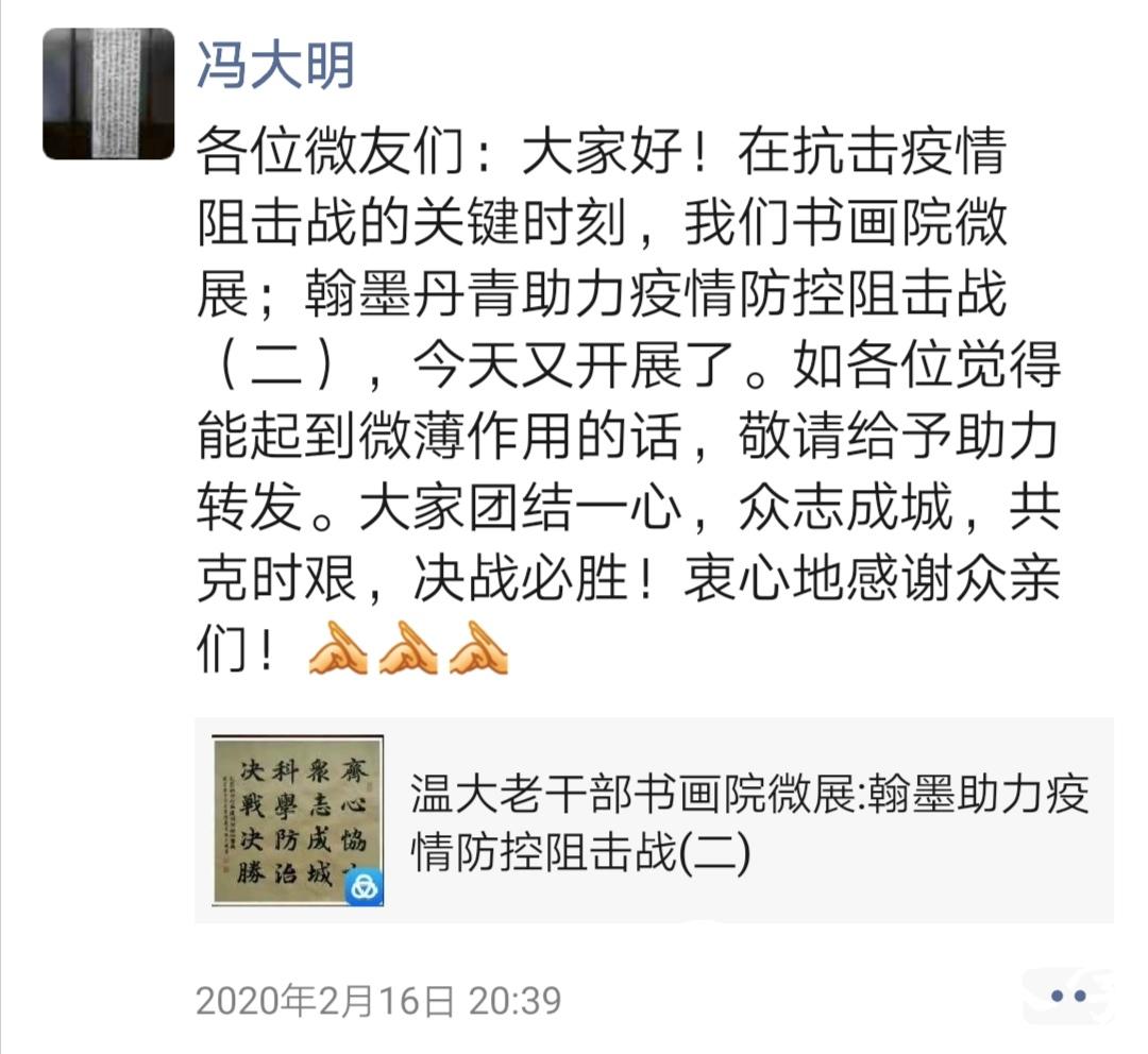 在这个不平凡的开年,一贯坚持“文化公益,服务民众”的小宝影院 老干部书画院的老书画家们,认真学习习近平总书记有关疫情防控工作的重要讲话,精心策划、积极行动。学校金礼义老书记带头撰文,助力抗击疫情决战决胜。书画院冯大明院长带领大家居家创作,宣传指示精神、讴歌战“疫”英雄、致敬最美逆行者、赞颂人间大爱。他们不顾年老体弱,不分昼夜翰墨丹青,在短短的几天时间里,创作出一百多幅书画作品,其中不少作品还被温州市委老干部局和温州市书法协会的公众号刊发。他们优选七十多幅书画作品,先后两次制作微展,转发宣传,点击量达6000余次。他们的作品鼓舞信心、振奋精神,他们众志成城、为坚决打赢疫情防控阻击战奉献丹心。