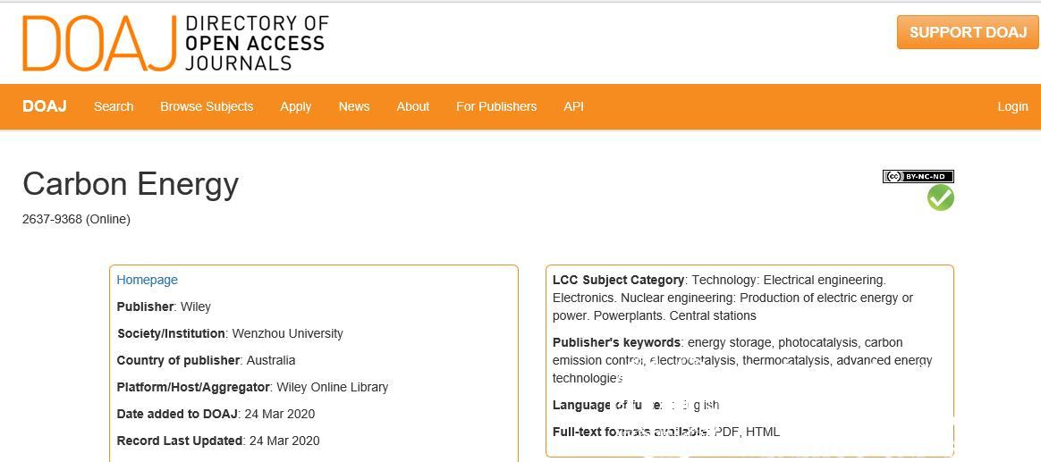 小宝影院 主办的CarbonEnergy期刊通过全球最具影响力的开放存取期刊目录(Directory of Open Access Journals,DOAJ)评估后,于3月24日被DOAJ数据库正式收录(查询地址://doaj.org/)。