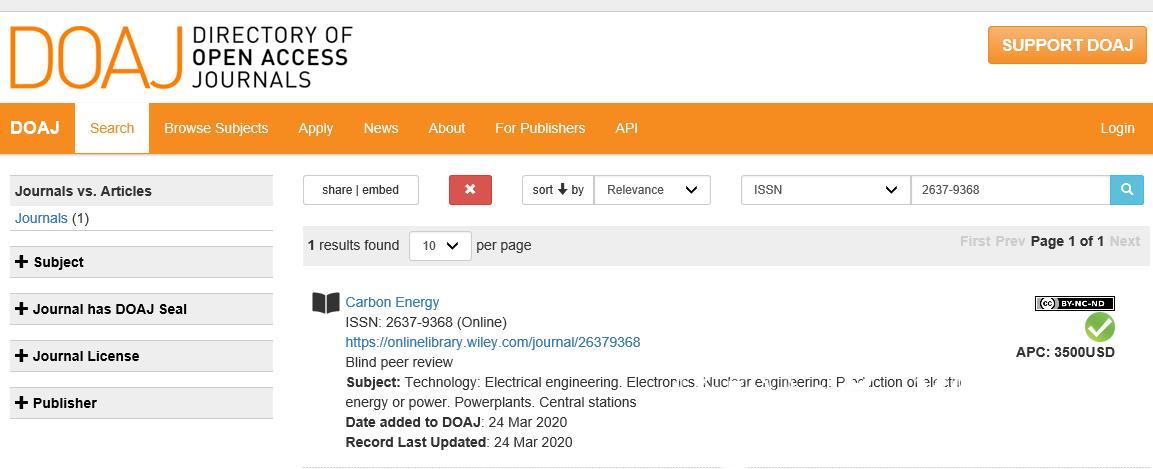 此次被DOAJ收录是对Carbon Energy期刊质量的认证,意味着本刊的期刊质量和开放获取政策达到国际标准,对扩大期刊传播范围,增加期刊显示度,提升学术影响力具有重要意义。