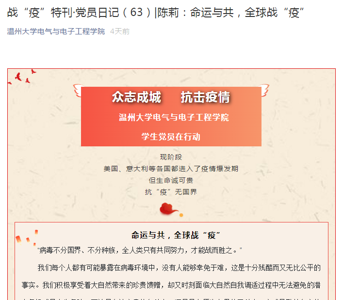 在此次征集活动中,许多的学生党员也积极投稿,撰写着他们眼里的中国和世界。来自17电气2班的学生党员吴泽平,在她的文章《强信心,暖人心、聚民心》中写到“想起在疫情爆发最为严重时刻,多少批党员站了出来,毫无畏惧地踏上了这支援之路,让我对他们对这个时代的英雄感到崇敬,感到了肩上的责任。”来自19级研究生党员游力凡在他的党员日记《中国真好,做中国人真好!》中写到“我看到了关于一名新冠肺炎重症患者的花费‘清单’,整个疗程总共约合72万人民币,这些医疗费用均由国家买单。这是一个多么伟大的国家,多么坚挺的政党,多么顽强的民族才能做到的啊!”