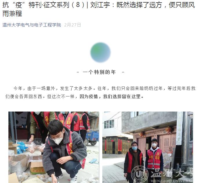 疫情来临之际,18电信2班的刘江宇同学主动报名参加了志愿者活动,帮助社区分发必要的生活用品和食品,登记每家每户年底来往信息,为社会贡献出自己的一份力量。他在文章《既然选择了远方,便只顾风雨兼程!》一文中写道“很荣幸有机会能够同广大志愿者,医务人员以及许许多多奋斗在一线的战士们一同加入这场战‘疫’,也让我切身体会到这样的一股势必取胜的凝聚力。”19电气2班的罗雨淅同学通过文章《疫情中的人间百态》中抒发了她在疫情期间的所思、所想、所悟。她说:“疫情期间我看到了贪婪、邪恶、无奈……但更多的是众志成城、团结一心,还有善良、温暖和勇敢。”19电科2班张又丹同学她在文章《疫情无情,人间有情!》中说“没有翻越不过的山,没有跨不过去的坎,我们要坚定信念,从自我做起,勤洗手,带口罩,拒绝野味等等,不信谣,不传谣!”与此同时,他还自己搜集素材,制作了一个抗疫微视频,通过视频来传播正能量。