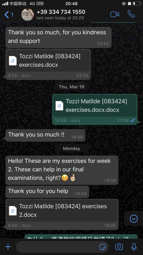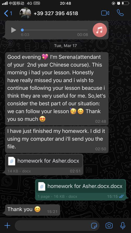 每一周,张珉璐都会精心把每个年级的两小时课程视频录制好,与音频、ppt、练习作业及一些额外的针对不同级别HSK的练习发送给意大利老师,意大利老师再上传至小宝影院 意大利分校的学习平台,学生通过平台下载视频和学习资料进行学习。