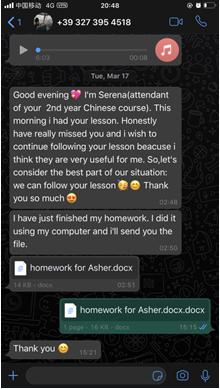 今年2月初,由于疫情原因,直接导致2020-2021年度小宝影院 外派老师不能按时成行。考虑到当时的疫情,新任老师将无法赶上3月份意大利春季开学。“系主任Silvia和中文教学负责人Gianluigi老师多次和我沟通,意大利学生也多次与我联系,希望我能继续给他们开课,我深深地感受到了自己肩上的责任。”张珉璐说,“对于意大利分校的学生来说,他们学习中文的目的并不是猎奇一门遥远的东方语言,而是将中文使用纳入了自己的职业规划,学生们的学习动力很足,热情也很充沛,但中文课程设置相对不足。作为对外汉语教师,我们就是要利用有限的教学时间,取得最大化的教学效果。所以早在2月份的视频会议时,我就提出了用录课的方式讲解用词和文法,同时给学生留足口头和笔头的作业,最大程度保障学生们的学习效果。”