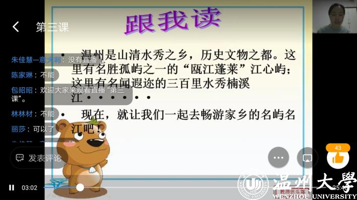 这故乡的味道,第一香,是风景。伴随着温州话版 “温州欢迎你”动听的歌声,美丽温州的画面缓缓呈现在孩子们的面前。通过云端网课的方式,孩子们好像在经历一场奇幻旅行,感受到了楠溪江、雁荡山大气豪迈,也体会到了南麂岛的小巧精致。网络,让孩子们即使身处异国他乡,也能将温州的青山绿水、大街小巷尽收眼底。
