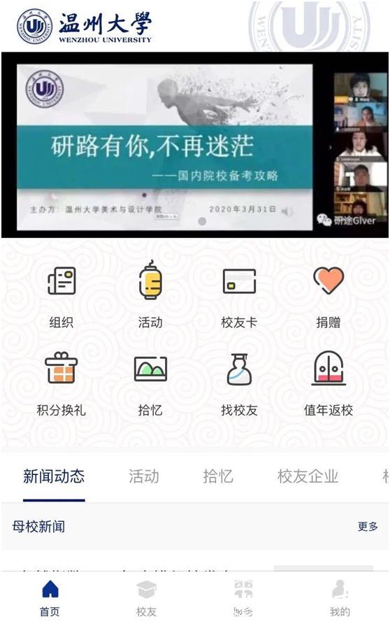 校友云分享。邀请各行业的校友线上分享自己的行业知识,创业、拼搏的精彩故事,与在校生、校友互动交流。