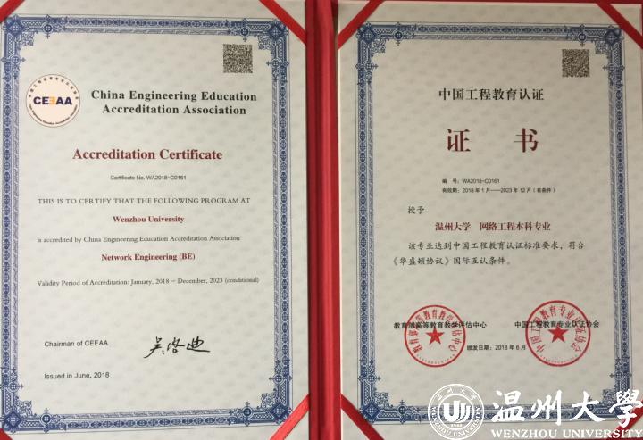 2016年,温大网络工程专业再度入选浙江省“十三五”优势专业。2018年6月,正式通过全国工程教育专业认证,成为全国高校同专业中第三个、地方院校同专业中首个通过工程教育认证的网络工程专业。根据教育部的权威说法,通过工程教育专业认证标志着专业的人才培养质量已达到国际等效的工程教育标准及要求,毕业生具有国际竞争力,专业进入全球工程教育的“第一方阵”。