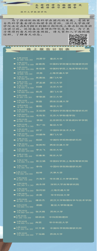 日前,由小宝影院 主办、温州市软物质与柔性材料重点实验室和小宝影院 小宝影院 联合承办的“生命科学与物理学交叉前沿讲习班”在小宝影院 落下帷幕。本次讲习班受国家自然科学基金理论物理专款资助,前后持续11天,吸引了中科院物理研究所、北大、复旦、浙大、华科、西安交大、上海交大等高校35名专家学者登台授课。