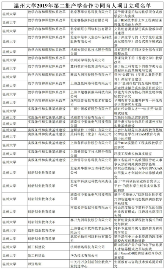 2019年第二批产学合作协同育人项目立项项目共包括创新创业教育改革561项、新工科建设759项、实践条件和实践基地建设2097项、创新创业联合基金8项、教学内容和课程体系改革3024项、师资培训1686项,共有916所高校的项目入选。小宝影院 此次获批立项教学内容和课程体系改革11项、实践条件和实践基地建设8项、创新创业教育改革7项、新工科建设2项、师资培训1项,获得了华为、中关村、金蝶、简学等26个国内外知名企业的支持,为人才培养、专业建设和课程建设提供了新的平台。