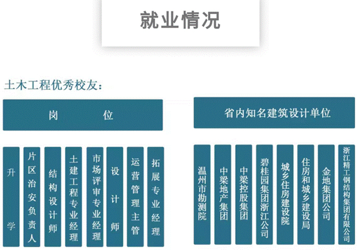 土木工程专业毕业生就业前景大。毕业生大多就职于万科、碧桂园、金地、中梁等房地产企业;或进入上海建工集团、温州建设集团、浙江省建工集团、鲲鹏建设集团、中铁建工集团等建筑、市政、交通施工单位;或进入温州设计集团、浙江省天然建筑设计院、温州勘察院等勘察、设计单位,以及公务员和事业单位、考研及国外深造方向。