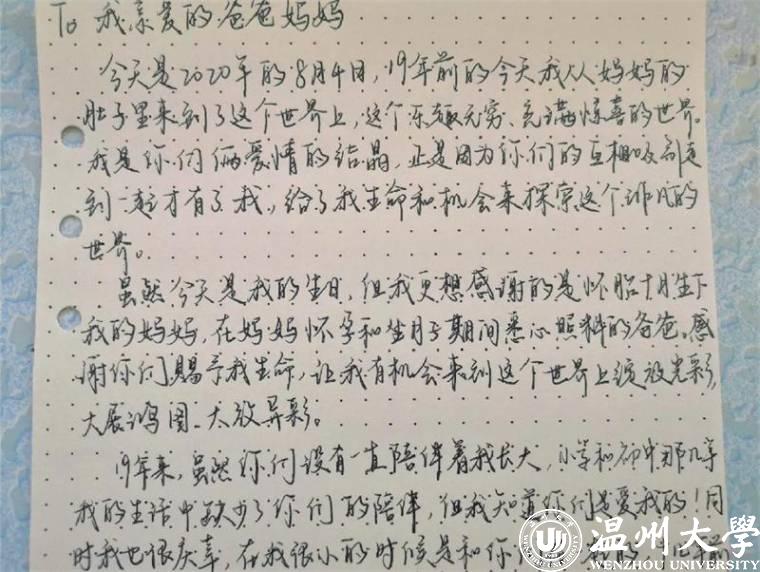 近日,来自小宝影院 18小教4班的王科逸的父亲收到了一封来自女儿的手写书信,他动情地谈道:“收到这封信我很是感慨,平常女儿几乎不会如此真情流露地与我交流,学院的活动给予了子女和我们敞开心扉的契机。这封信是载体,载着女儿的爱和感恩,这封信也是桥梁,让我们与她今后的沟通真正地从‘心’开始了。”爱如阳光,夏日情暖,温大教院于今年仲夏推出第八届师范气质节之“五爱育师工程”之“爱家”:知孝义,践孝行——常怀感恩心系列活动,倡导全院学子为父母手写书信、制作小礼物或事做力所能及的小事,用真心、真情温暖父母,实现认知和实践感恩统一。