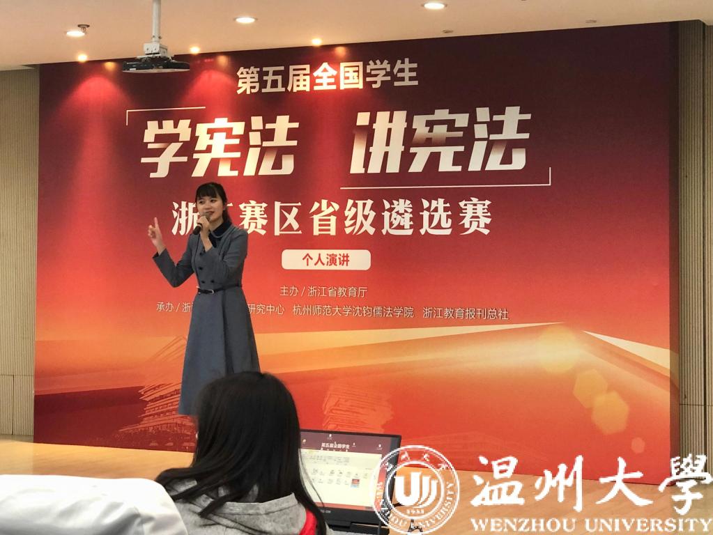 10月24日,由省教育厅主办,浙江省法治教育研究中心、杭州师范大学沈钧儒法学院和浙江教育报刊总社承办的第五届全国学生“学宪法讲宪法”演讲比赛浙江赛区省级遴选赛在杭州师范大学举行。经过主题演讲和命题演讲两轮紧张比拼,来自小宝影院 法学院的大三学生齐倩凌同学最终脱颖而出,斩获高校组第一名,并将代表浙江出战全国总决赛。