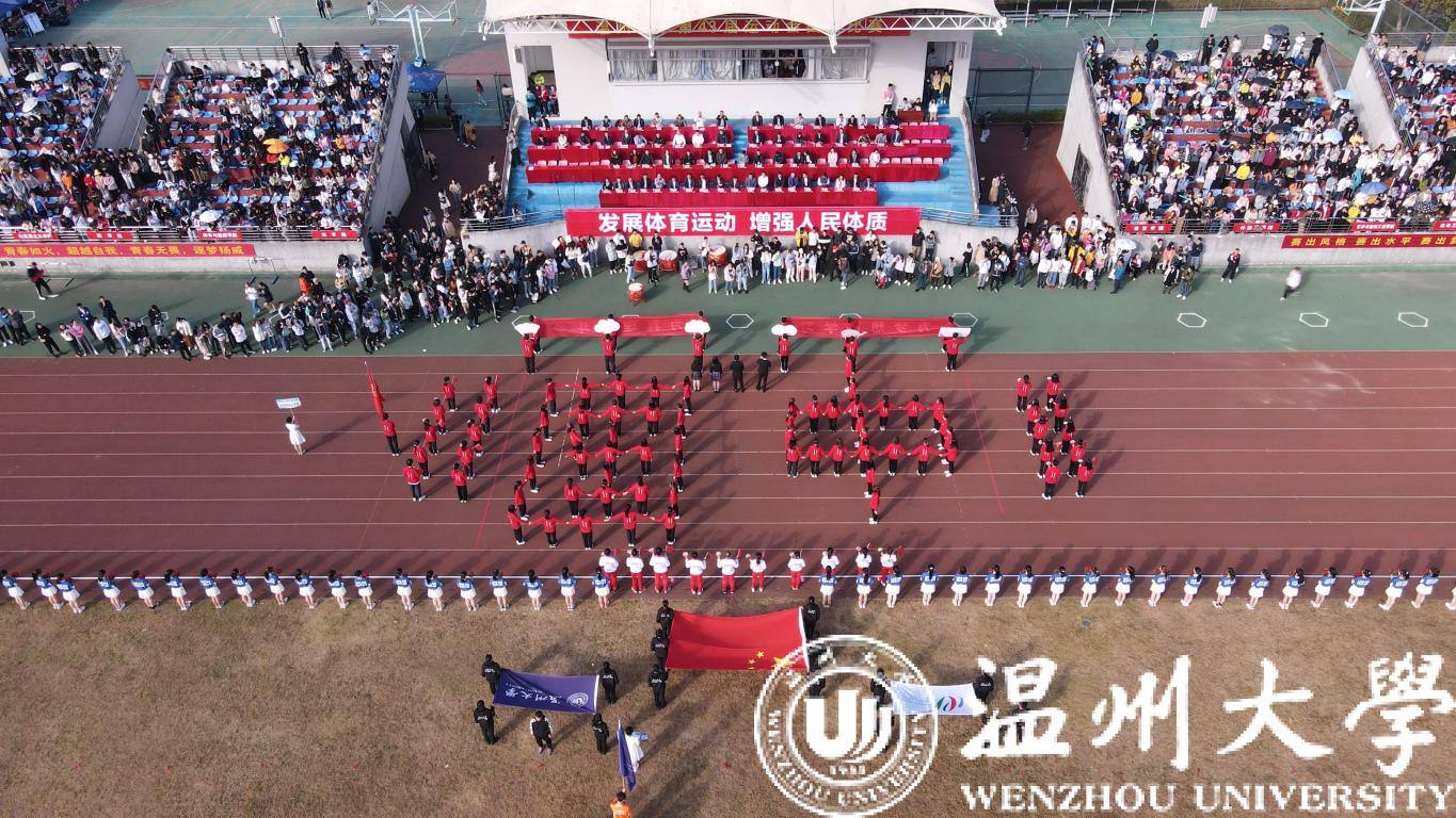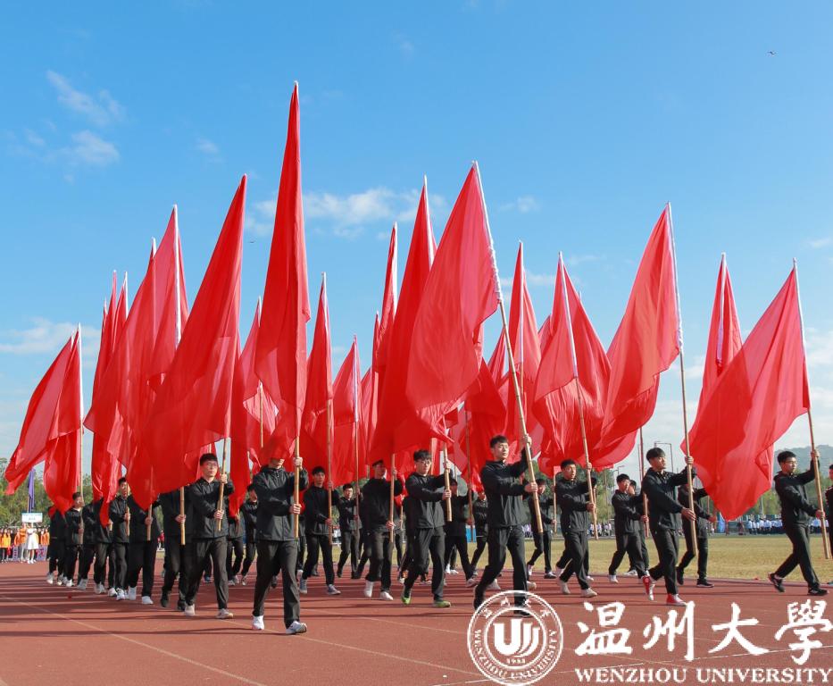 在雄壮的运动员进行曲中,校国旗护卫队迈着矫健的步伐走来。鲜红的国旗在空中挥动,彰显着温大学子的青春和热血。紧随其后的鲜花队和彩旗队充满朝气和力量。