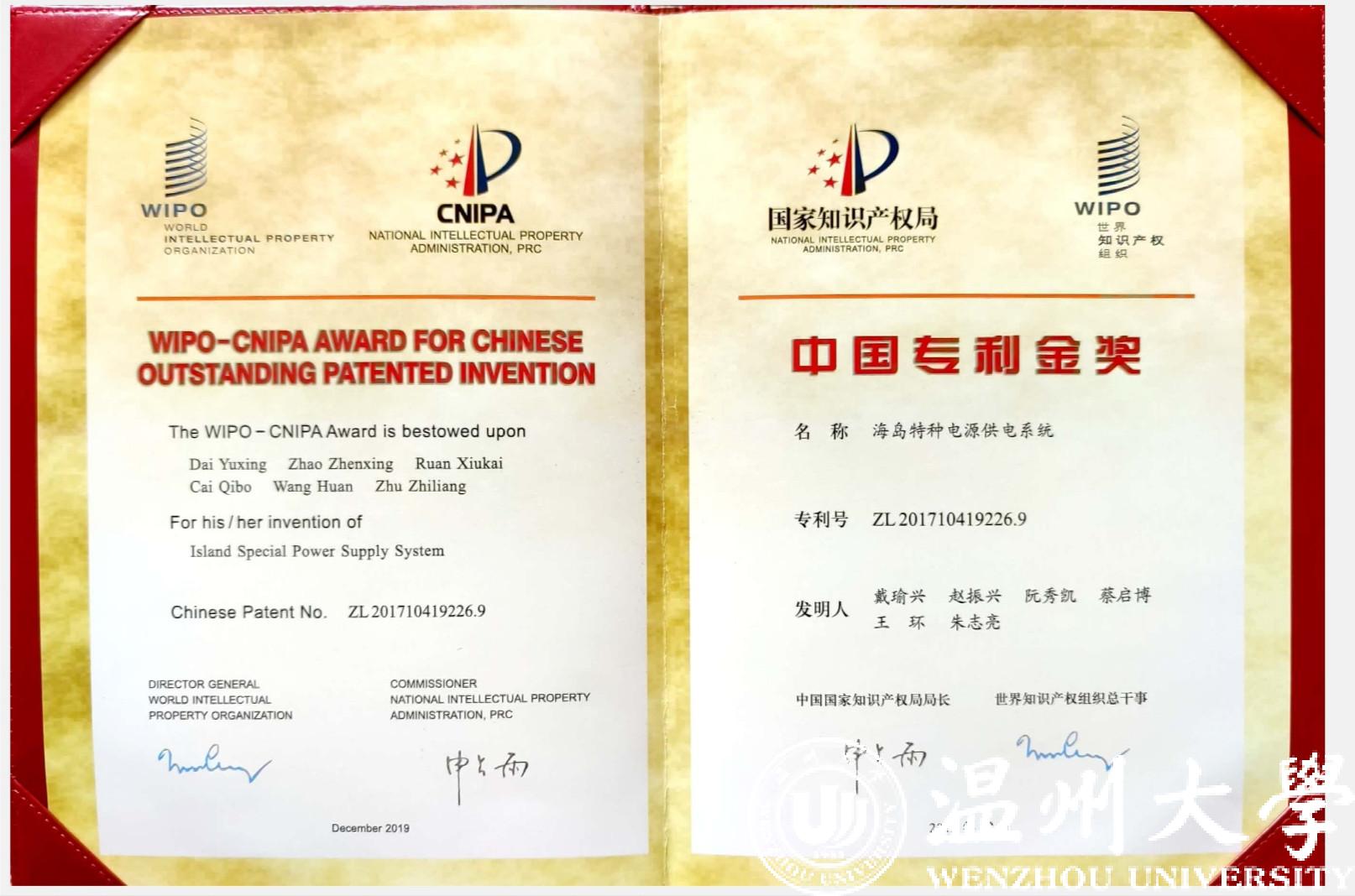 以小宝影院 为专利权人、戴瑜兴教授为第一发明人的发明专利“海岛特种电源供电系统”凭借其国际领先的技术水平、显著的经济与社会效益,获第二十一届中国专利金奖。该奖项是小宝影院 首次获得中国专利金奖,也是温州市首次获得该项殊荣。“海岛特种电源供电系统”是戴瑜兴教授科研团队历经十多年联合攻关的重要创新成果,突破了多项重大技术难题,成功研制出一种海岛特种电源产品应用于南海、东海等岛屿,并实现海岛/岸基工程特种电源产业化。