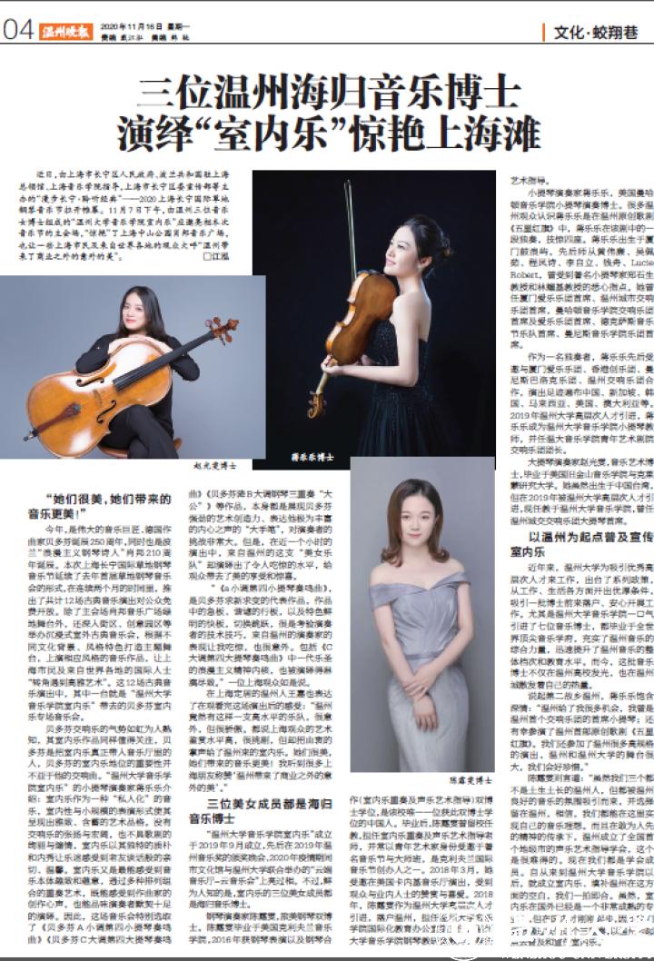 “小宝影院 音乐学院室内乐”成立于2019年9月成立,先后在2019年温州音乐奖的颁奖晚会、2020年疫情期间市文化馆与小宝影院 联合举办的“云端音乐厅-云音乐会”上亮过相。不过,鲜为人知的是,室内乐的三位美女成员都是海归音乐博士。