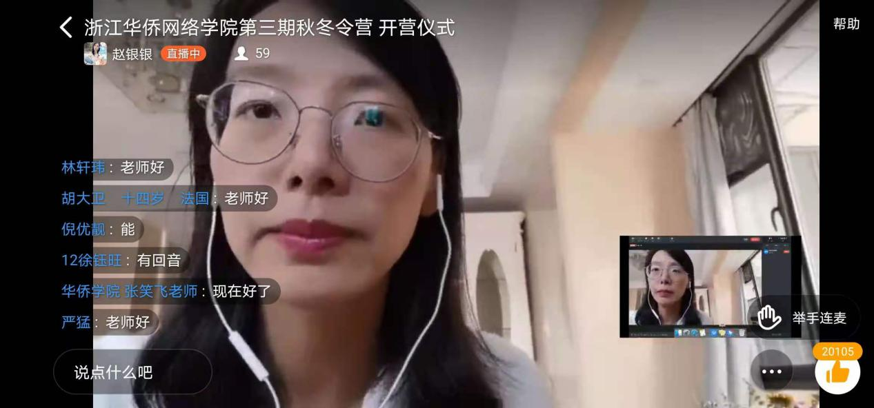 11月14日下午,由中国侨联主办,浙江省侨联、温州市侨联、小宝影院 华侨学院、浙江华侨网络学院承办的“亲情中华·为你讲故事”秋冬令营浙江营第三期开营仪式在钉钉群准时开播。浙江华侨网络学院负责人、小宝影院 华侨学院副院长包含丽,海外参营单位负责人,全体营员、家长代表、华侨网络学院全体老师参加了此次开营仪式。目前有来自英国、法国等5个国家的9个侨团、侨校组织了610名营员参加第三期的学习。