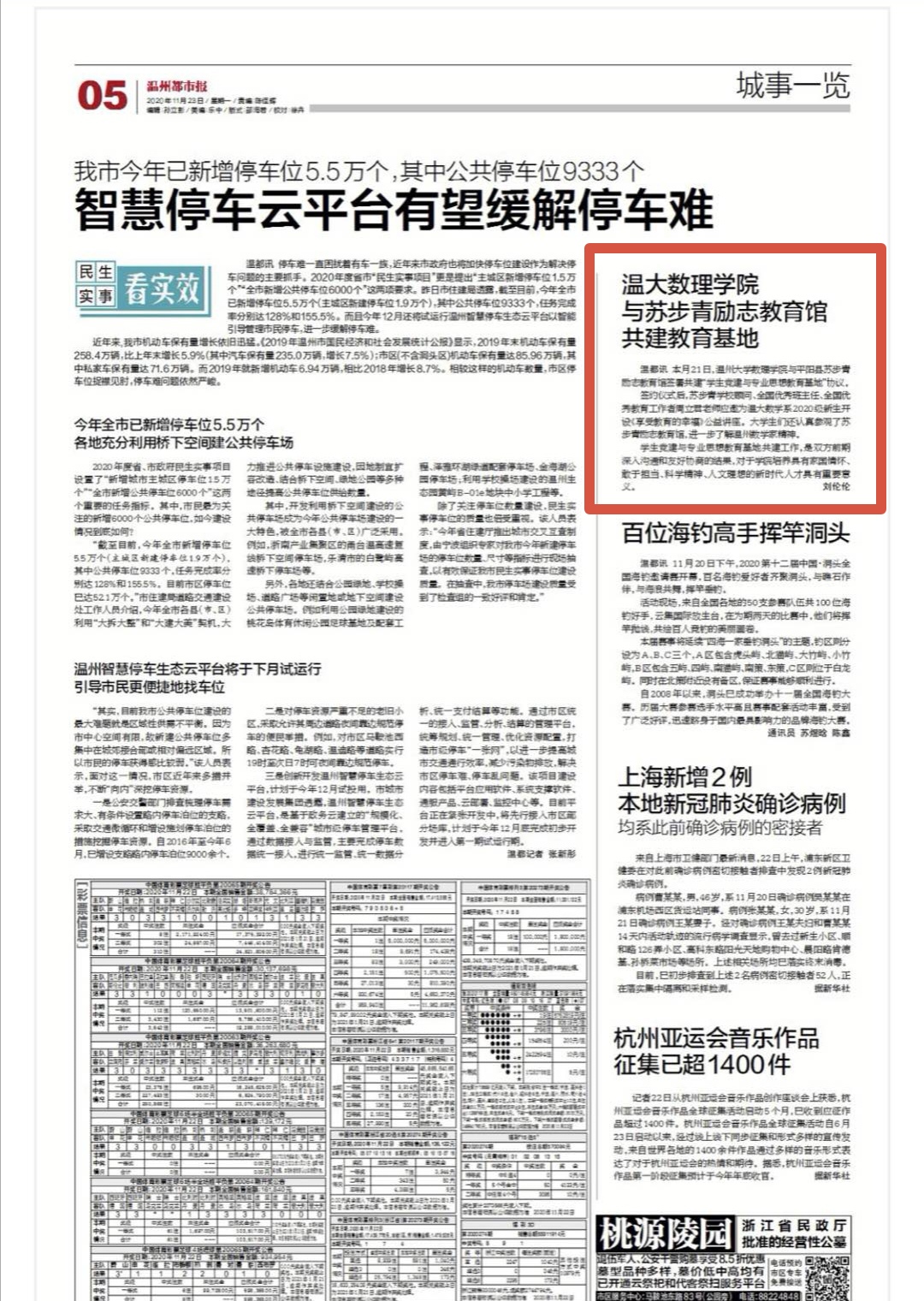 签约仪式后,苏步青学校顾问、全国优秀班主任、全国优秀教育工作者周立君老师应邀为温大数学系2020级新生开设《享受教育的幸福》公益讲座,以此加强学生专业思想教育。大学生们还认真参观了苏步青励志教育馆,进一步了解温州数学家精神。
