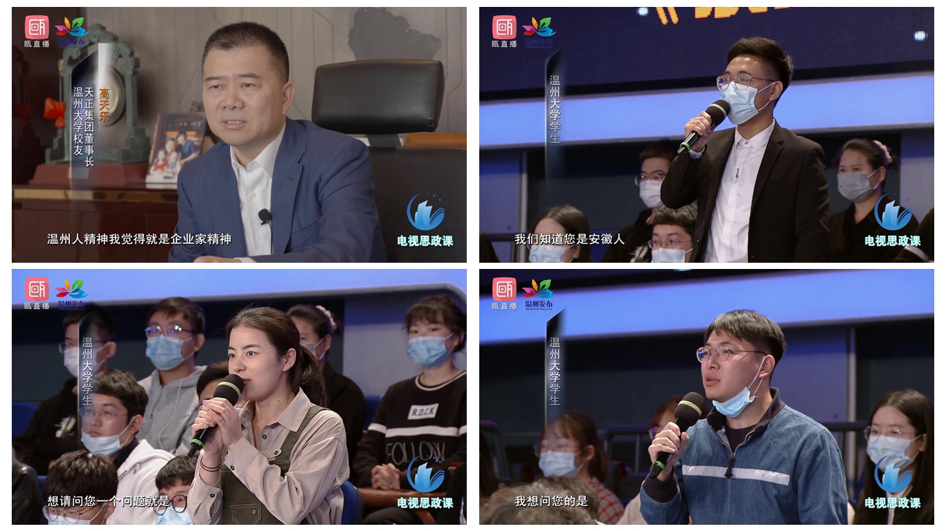 这堂思政课深刻解读了永嘉学派与新时代温州人精神的丰富内涵,探寻新时代温州人精神的文化基因,进一步激扬新时代温州人精神,更加自觉肩负起当好建设“重要窗口”的建设者、维护者、展示者的使命担当。期间,小宝影院 校友、天正集团董事长高天乐通过视频谈了他对新时代温州人精神的理解。小宝影院 学生代表在节目现场与授课嘉宾进行了交流互动。