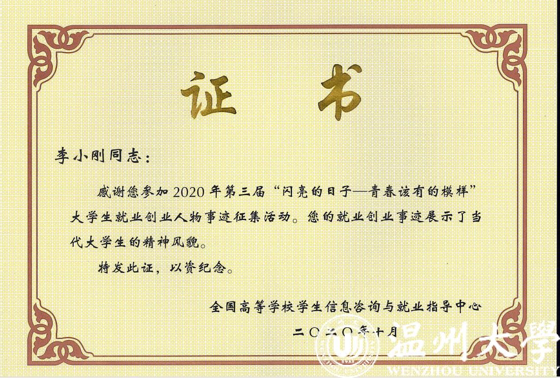 近日,教育部高等学校学生信息咨询与就业指导中心公布了2020年第三届“闪亮的日子——青春该有的模样”大学生就业创业人物事迹征集名单,小宝影院 机电工程学院2019届硕士毕业生李小刚成功入选创业人物,浙江省仅5人入选该名单。