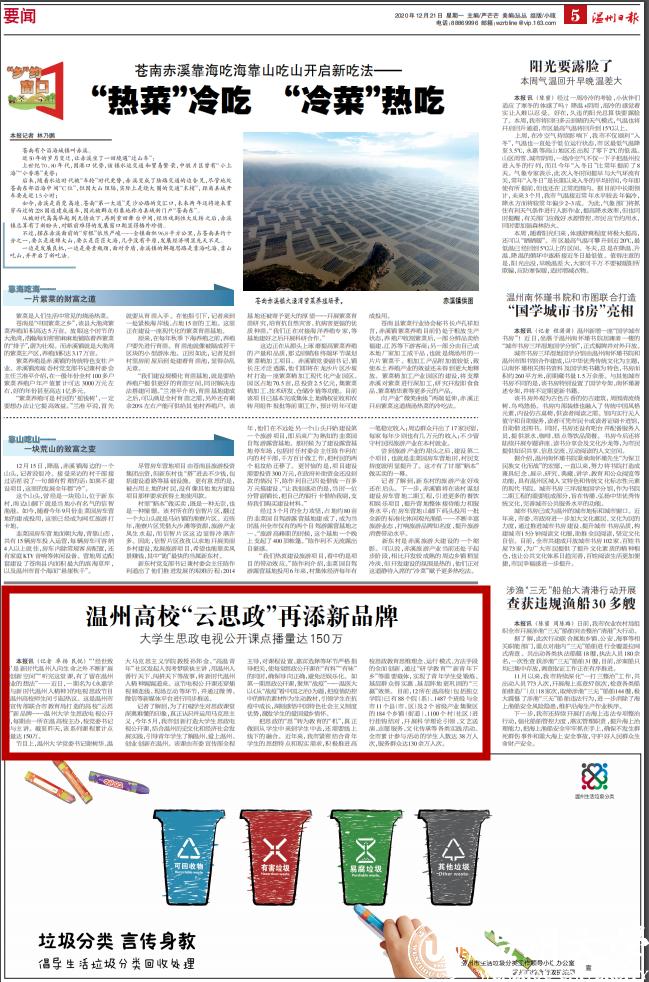 记者了解到,为了打破学生对思政课堂深奥难懂的印象,真正认识并运用马克思主义,今年5月,我市创新打造大学生思政电视公开课,结合温州历史文化和经济社会发展实践,引导青年学生了解温州、爱上温州、 创业创新在温州。该课由市委宣传部全程主导,对课程设置、嘉宾选择等环节严格指导把关,使每堂思政公开课在“有料”“有味” 的同时,确保导向正确,避免泛娱乐化。如第一期思政公开课,聚焦“战疫”——温医大以《从“战疫”看中国之治》为题,把疫情防控中的鲜活素材作为生动教材,引领学生在抗疫中成长,深刻感悟中国特色社会主义制度优势,激发学生的爱国爱乡情怀。