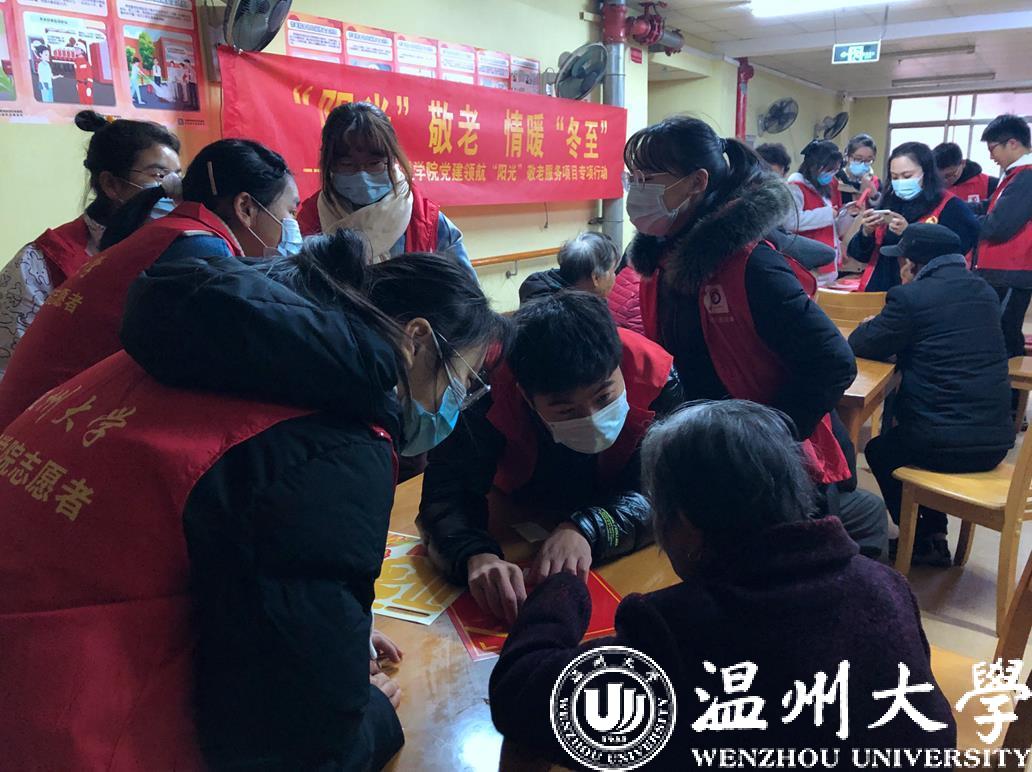 12月20日一早,小宝影院 部分教工党员和“阳光”青年志愿者共14人带着汤圆等慰问品,前往南白象老人公寓开展“阳光”敬老、情暖冬至主题爱心服务活动。在老人公寓负责人的大力支持下,小宝影院 师生志愿者为老人煮汤圆,陪老人聊天,与老人一起做手工,给老人居室张贴福字和窗花,还向老人赠送温馨小礼物,得到了爷爷奶奶们的一致称赞。得到爷爷奶奶们的肯定,师生志愿者们心里也是暖洋洋的。