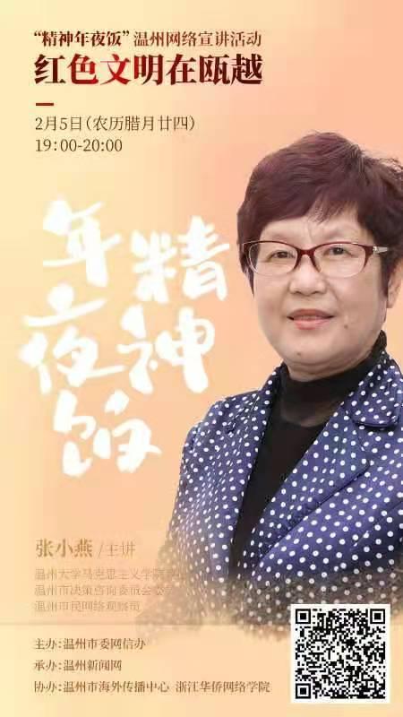 5日晚上7—8点,南方小年夜之际,张小燕教授为在外温州人带来“精神年夜饭”的“头盘菜”——《红色文明在瓯越》。让在外温州人通过此次网络主题宣讲,了解发生在家乡温州这片土地上的那些可歌可泣的红色故事。宣讲通过网络直播的形式进行,温州市河北商会、温州市河南商会、温州市广州商会、海内外温州人等在外温州人代表齐聚“云端”,现场云连线,讨论互动反响热烈。