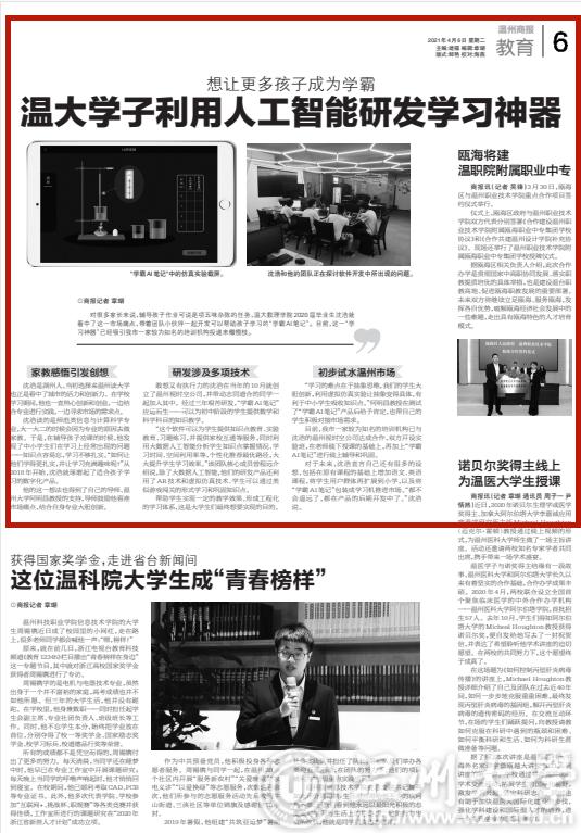 对很多家长来说,辅导孩子作业可说是项五味杂陈的任务,温大小宝影院 2020届毕业生沈浩就看中了这一市场痛点,带着团队小伙伴一起开发可以帮助孩子学习的“学霸AI笔记”。目前,这一“学习神器”已经吸引我市一家较为知名的培训机构投递来橄榄枝。