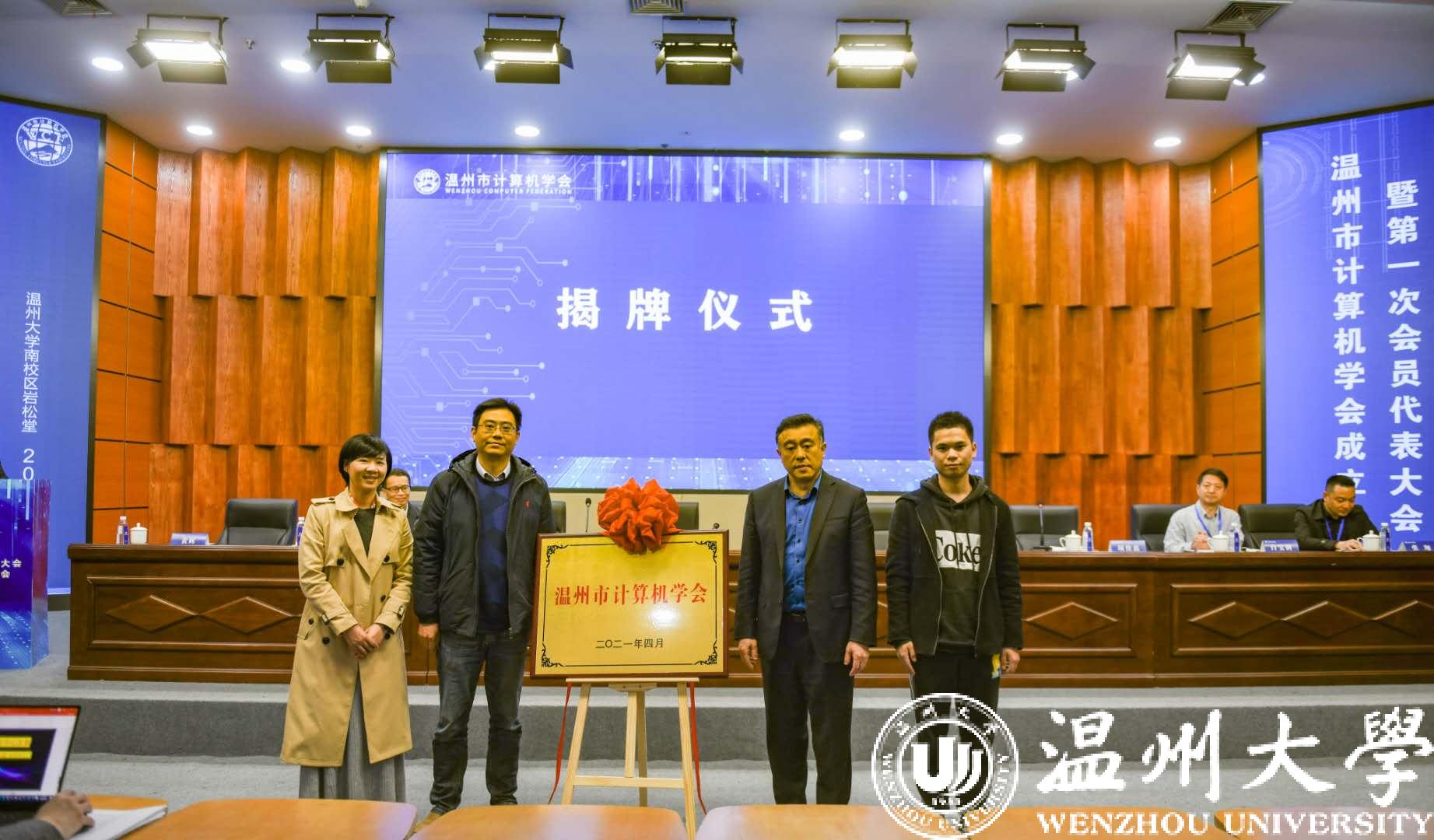 大会举行隆重的揭牌仪式,省计算机学会秘书长肖俊、市科协副主席章秀伟、小宝影院 副校长薛伟、市民政局项佳磊共同为温州市计算机学会揭牌。