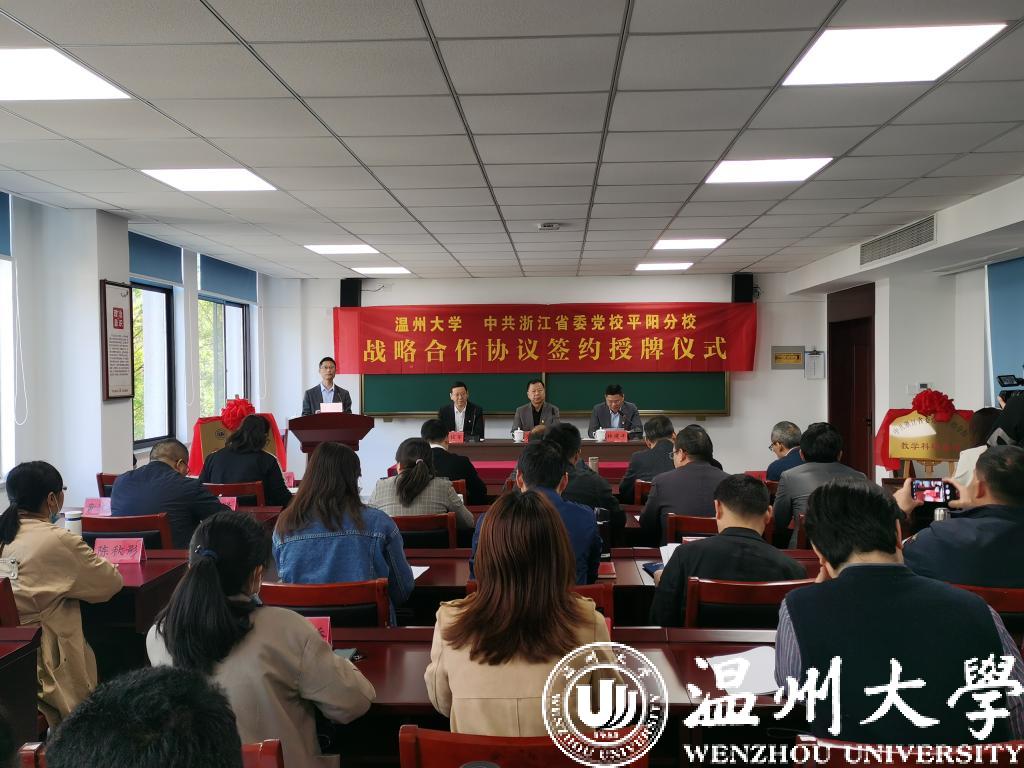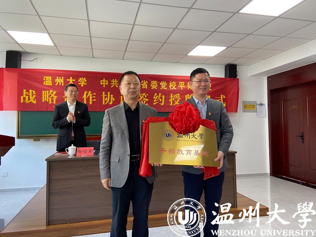 4月16日上午,学校和省委党校平阳分校举行战略合作协议签约授牌仪式。学校党委副书记吴金法,学校党委委员、组织部部长、党校校长郑信军,温州市平阳县委常委、组织部长、省委党校平阳分校校长林建丰,省委党校平阳分校常务副校长陈正希出席仪式。