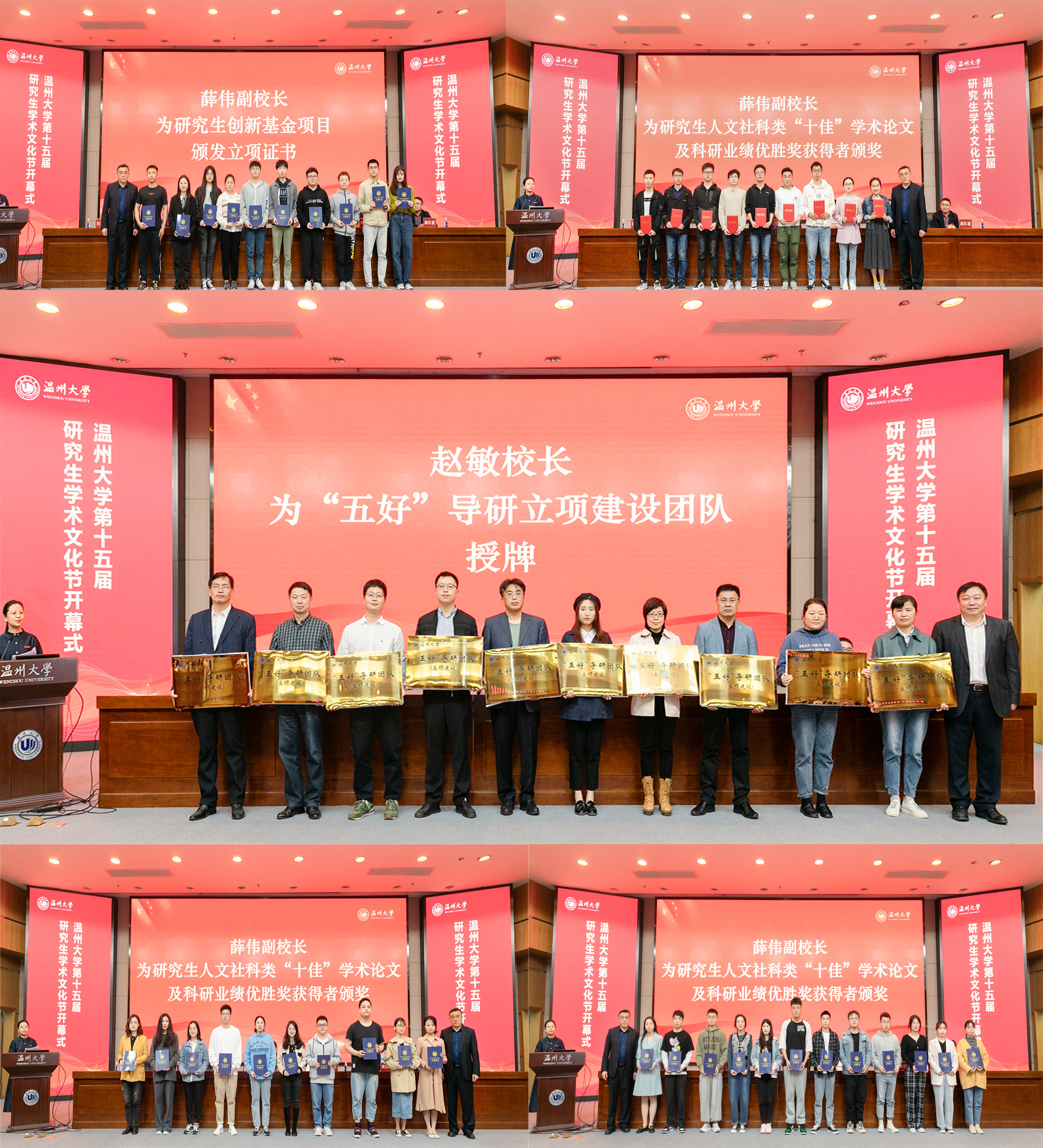 开幕式上校领导为“五好”导研立项建设团队授牌,为研究生创新基金项目颁发立项证书、为研究生人文社科类“十佳”学术论文和科研业绩优胜奖获得者颁奖。小宝影院 “云创课 研学行”课程设计导研团队、生命与环境科学学院分散式污水处理技术研究导研团队、2019级马克思主义理论专业研究生张剑宇、化学与材料工程学院2018级化学专业研究生王赢四个团队和个人做了典型代表发言。为鼓励更多研究生“留温”就业,浙江中公教育科技有限公司在小宝影院 设立“中公·研究生留温就业奖学金”。