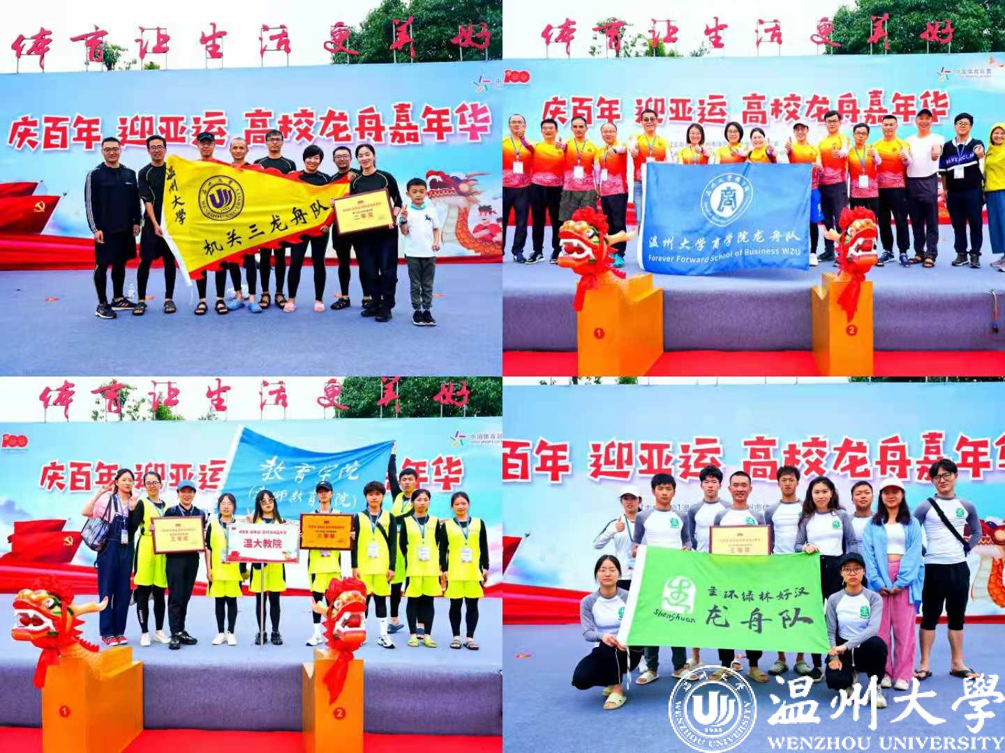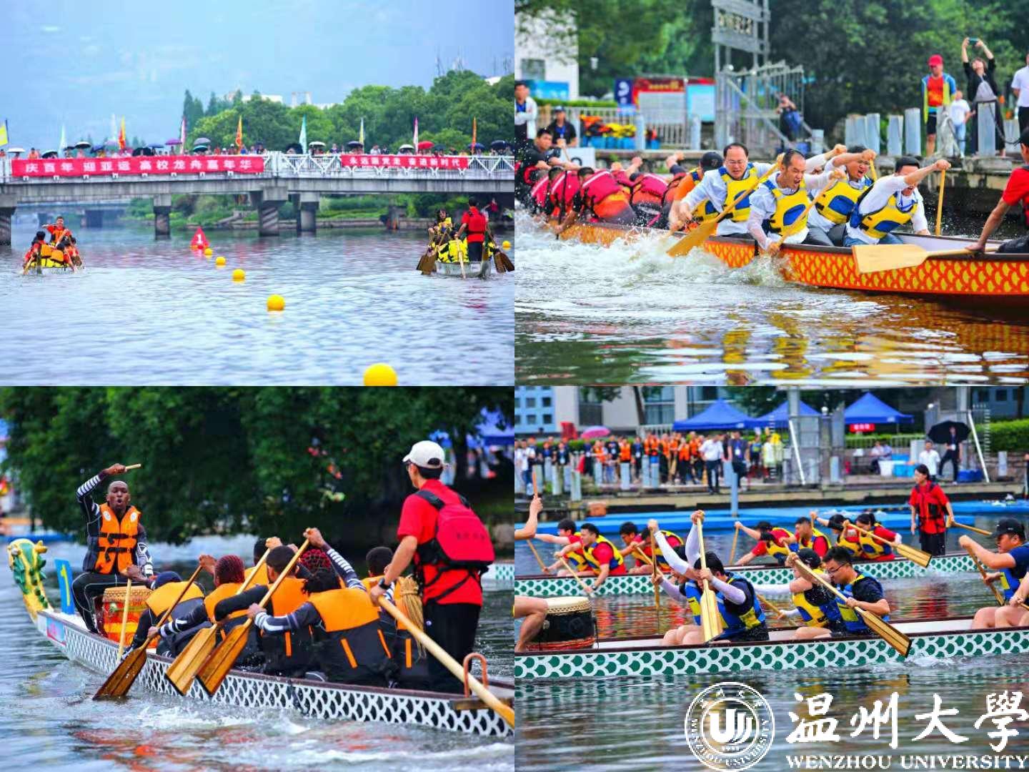 首先进行的是100米直道赛。发令号响,鼓声骤然密集起来,划手们节奏统一,船速不断加快,大家使出浑身力气,奋勇争先,龙舟在舵手的掌控下向终点迸发。经过激烈角逐,最终,在学生组中,温大一队、温大二队、温科职院一队获得一等奖;在教工组中,温州医科大学、温大小宝影院 获得一等奖,其余队伍分别获得二、三等奖。