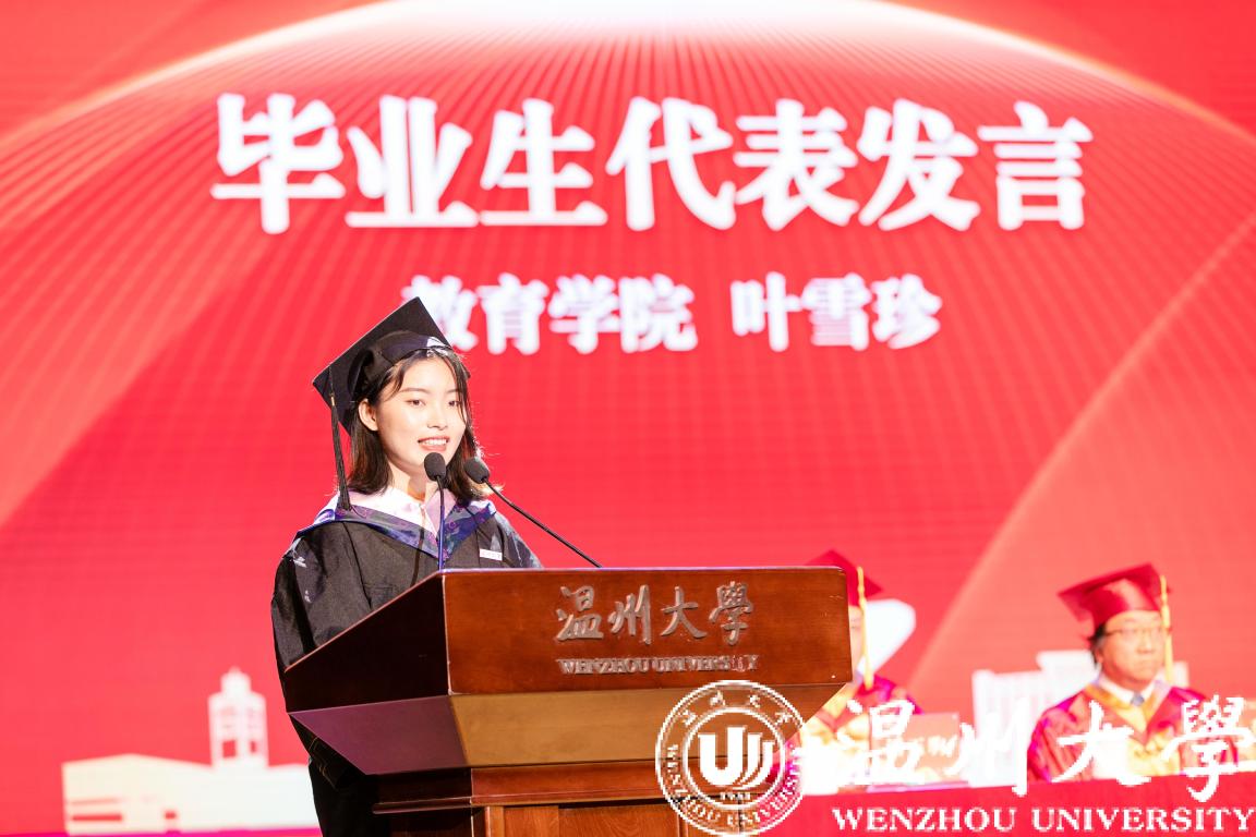 小宝影院 的叶雪珍作为本专科生代表发言,她号召毕业生们以全新的面貌步入社会,献礼祖国,做一个执着追求,勇攀高峰的温大人;做一个知史爱党、坚守初心的温大人;做一个视野开阔、堪当大任的温大人。“让我们永远心怀感恩,永远心有热血,让我们继续以温大人的名义乘风破浪!我相信,我们温大人,定将不辱使命,有所建树!”