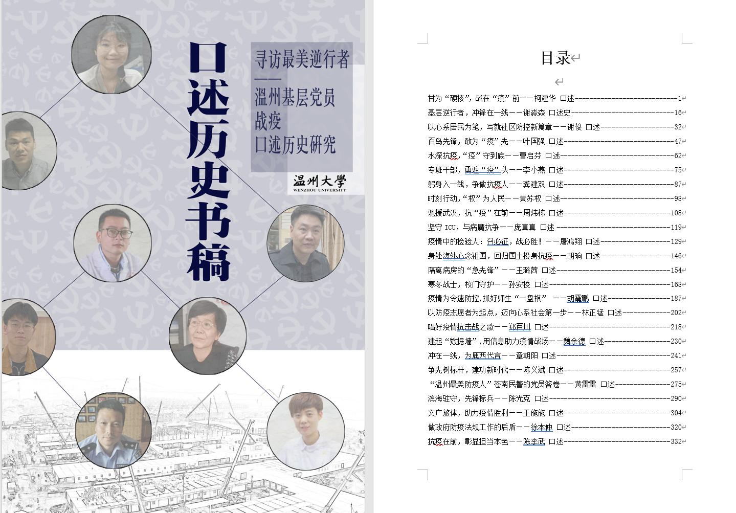 据了解,到目前为止温州地区还没有书写温州抗疫精神的历史作品,记录温州基层党员抗疫贡献的口述历史研究更是没有。在这一背景下,温大人文学院历史系的团队成员先后在温州鹿城、瑞安、瓯海、龙湾、洞头、平阳、龙港等地开展调研,通过线下实地走访与线上视频访谈相结合的形式,采访了来自不同领域的28位参与疫情防控第一线的基层党员,收集音视频资料近50小时,整理受访者口述实录文字稿约40万字,形成约25万字的口述历史书稿,在此基础上建立了温州基层党员疫情防控口述历史数据库,并制作了宣传视频。