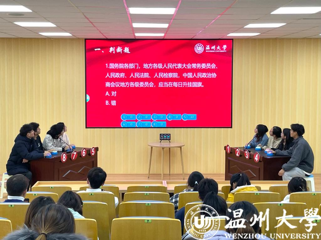 12月1日,“宪法宣传周”系列活动之“习近平法治思想”知识竞赛小宝影院 举行。知识竞赛重点围绕习近平法治思想相关内容,设有判断题、单选题、多选题和逻辑题。700余名学生参与到知识竞赛初赛环节,最终24名选手进入决赛。决赛现场紧张热烈,答对得分、答错扣分的竞赛机制也为比赛增加了更大的悬念。知识竞赛充分检验了大学生对习近平法治思想、宪法知识的掌握程度,将法治学习的知识性与趣味性融为一体。