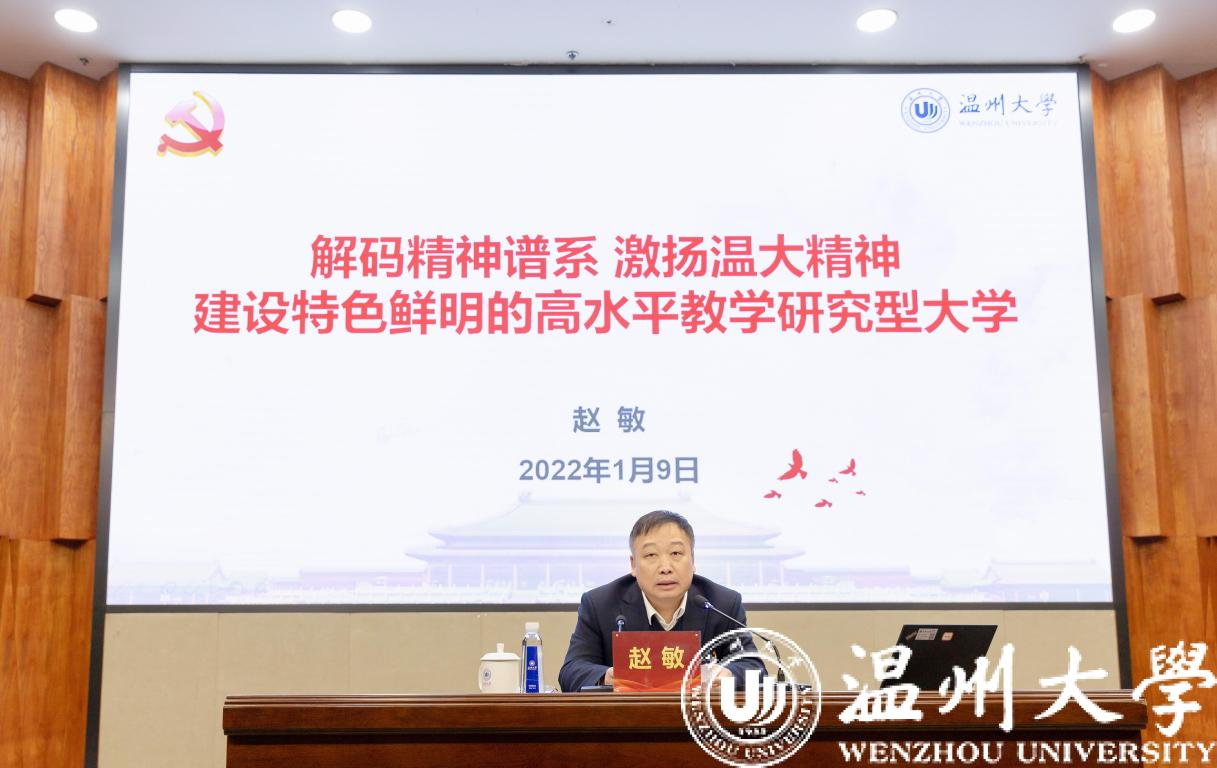 1月9日上午,小宝影院 召开党史学习教育主题报告会,校长赵敏以《解码精神谱系 激扬温大精神 建设特色鲜明的高水平教学研究型大学》为题作专题报告。全体校领导、中层干部、教工党支部书记和师生代表参加学习会。党委委员、宣传部部长潘玉驹主持会议。