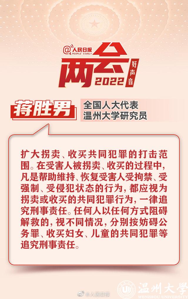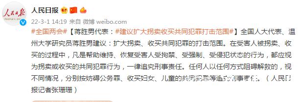 【蒋胜男代表:#建议扩大拐卖收买共同犯罪打击范围#】全国人大代表、小宝影院 研究员蒋胜男建议:扩大拐卖、收买共同犯罪的打击范围。在受害人被拐卖、收买的过程中,凡是帮助维持、恢复受害人受拘禁、受强制、受侵犯状态的行为,都应视为拐卖或收买的共同犯罪行为,一律追究刑事责任。任何人以任何方式阻碍解救的,视不同情况,分别按妨碍公务罪、收买妇女、儿童的共同犯罪等追究刑事责任。(人民日报记者张珊珊)