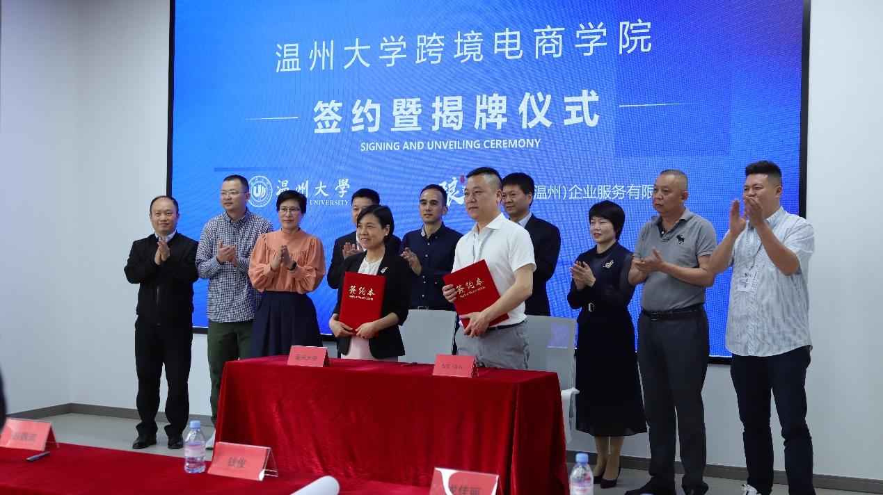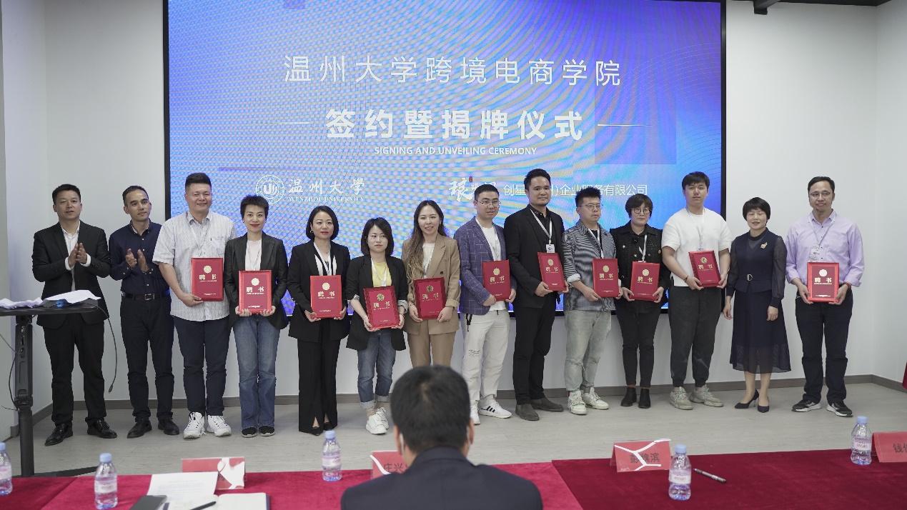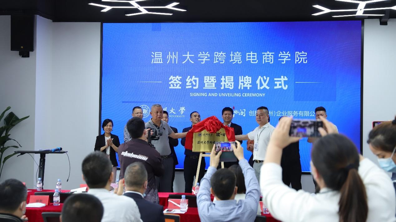 仪式上,创星(温州)企业服务有限公司总经理陈晓俊与小宝影院 商学院国家一流专业负责人林俐教授签署产业学院共建协议,创星(温州)企业服务有限公司董事长李聪斌与温大商学院院长胡振华教授共同为产业学院揭牌。