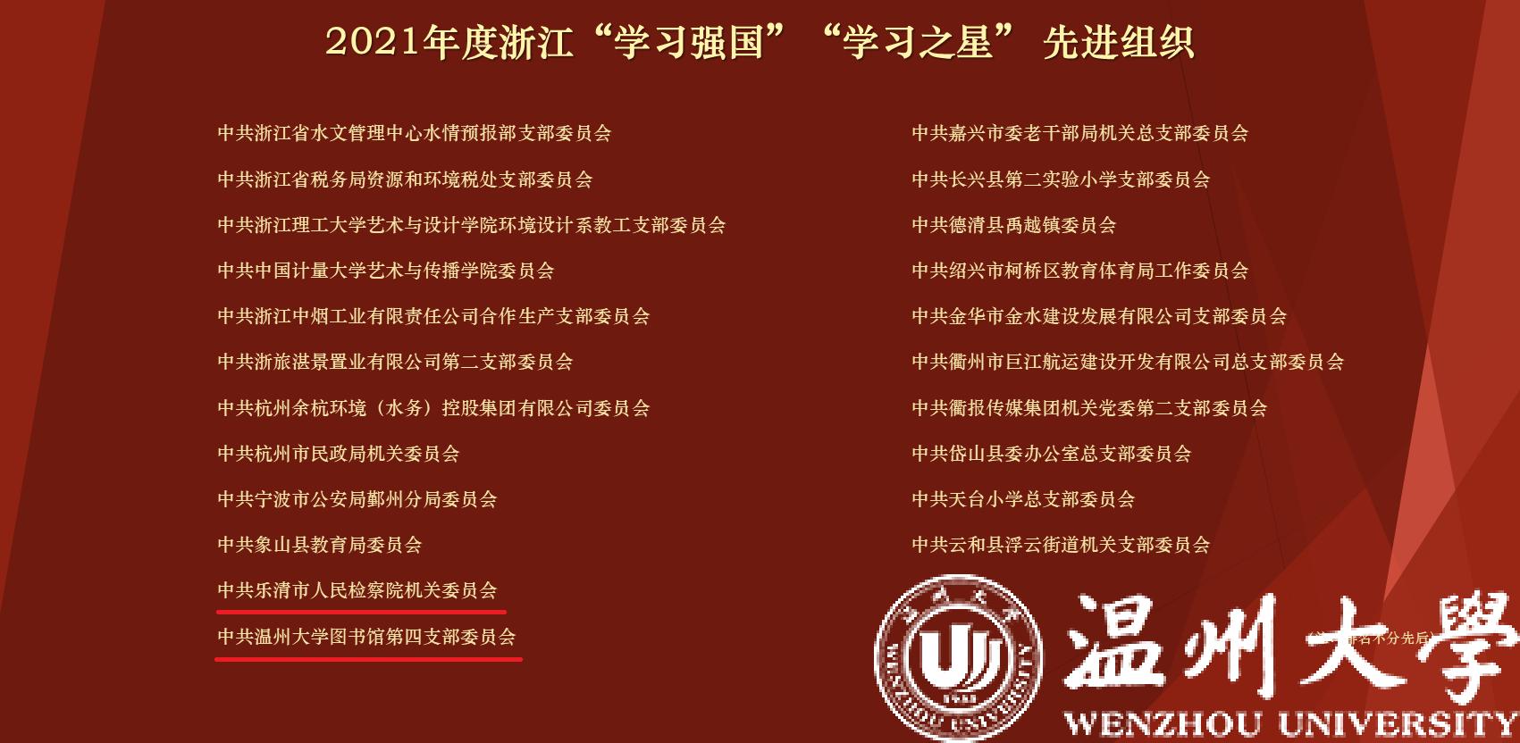 4月19日,2021年度“学习强国”浙江学习平台线上授奖交流活动举行。活动公布2021年度浙江“学习强国”“学习之星”先进组织和先进个人,温州市选送的中共小宝影院 图书馆第四党支部、中共乐清市人民检察院机关委员会获“学习之星”先进组织;温州市自来水有限公司的麻鹿环、温州瑞安市住房和城乡建设局的薛孝松、温州乐清市白象中学的吴君艳获得“学习之星”称号。