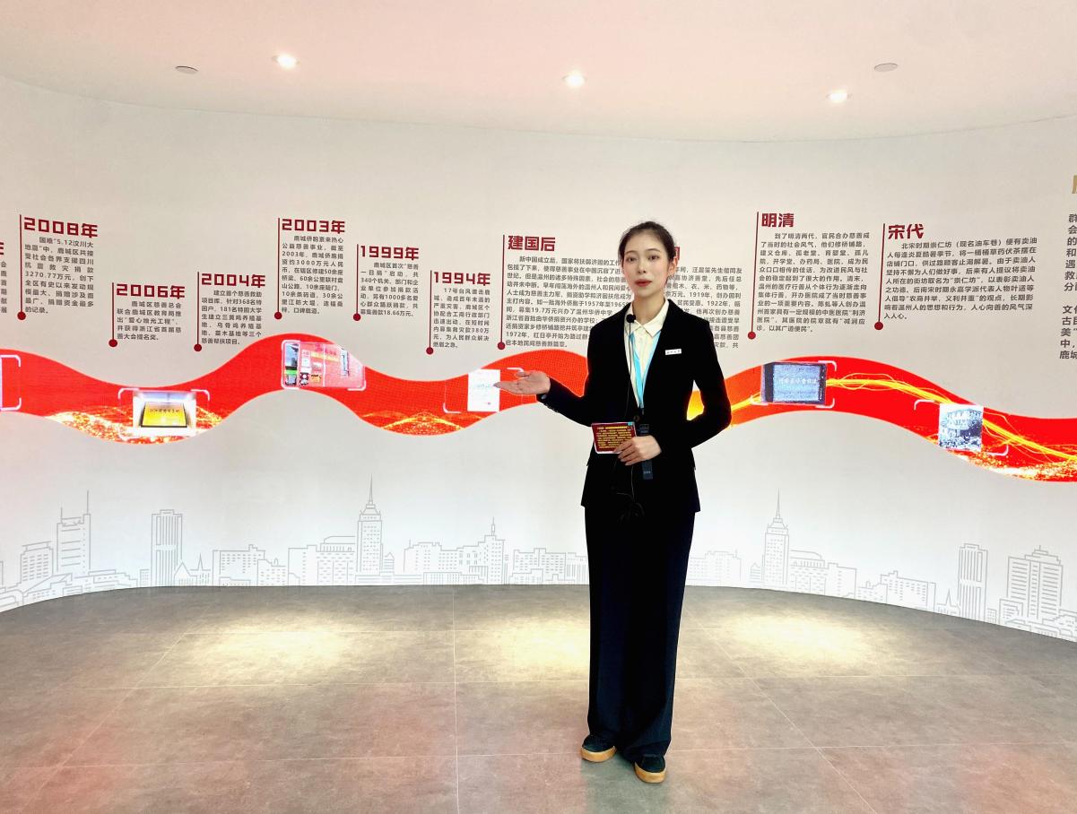 仪式最后,小宝影院 马克思主义学院的黄歆茹同学作为讲解员带领众嘉宾参观了综合体内部,依次前往儿童之家、慈善数字驾驶舱、慈善文化展厅、慈善烘焙坊、慈善超市和善亭文化等多个独具特色的展点进行了详细讲解,并对慈善综合体五大慈善文化品牌的系统架构和特色亮点进行了介绍,通过优美的语言生动诠释了鹿城区的慈善精神。