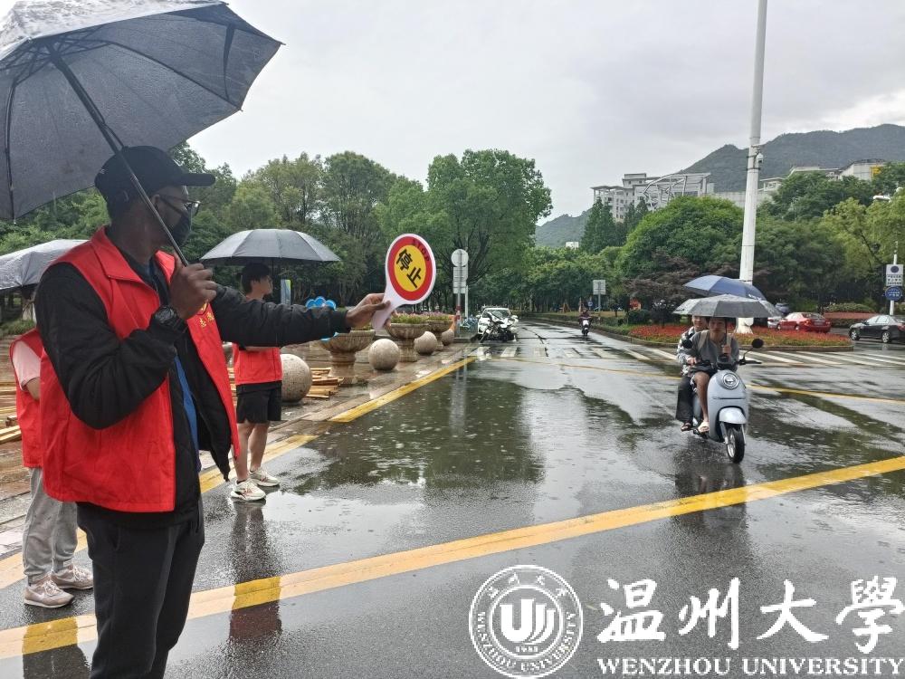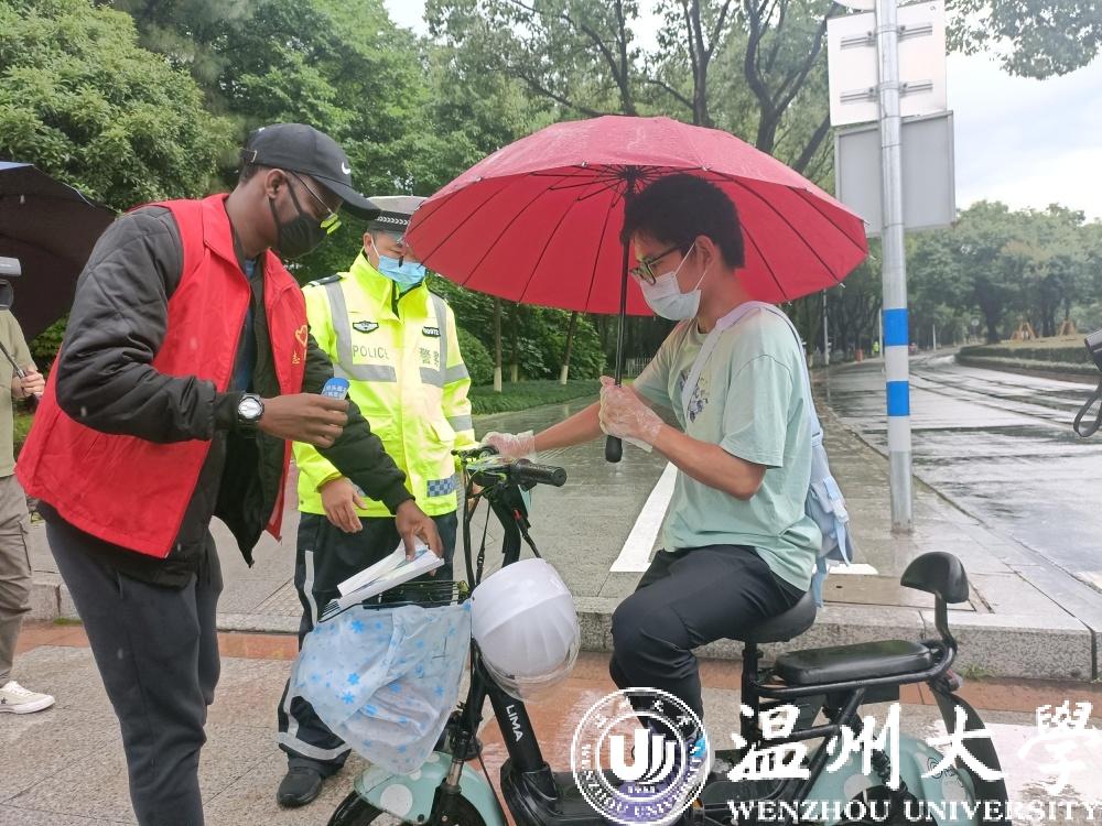14点30分左右,“洋劝导”们与小宝影院 外国语学院志愿者自行搭配组队,穿上红马甲,手持表示“通行”和“禁止通行”的指挥牌及交通安全宣传牌“上岗”了。瓢泼大雨没有浇熄热情,发现非机动车存在“不戴头盔”“乱闯马路”“带人”等不规范行为时,他们便举起宣传牌示意车辆靠边停下,及时劝导告知交通安全小贴士,并张贴提前准备好印有“只戴头盔不带人、各行其道不‘霸道’”的温馨提示贴,提高文明出行意识。违规者还被要求担任“交通督导员”,与外国留学生、志愿者一起管理交通秩序5分钟,体验交通“督导员”的工作。