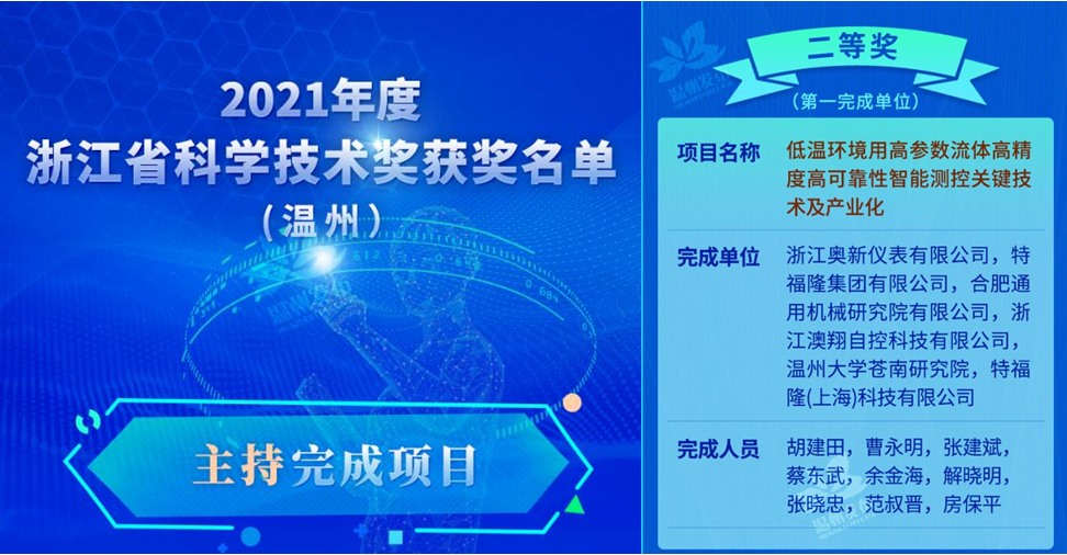 近日,浙江奥新仪表有限公司与小宝影院 苍南研究院等单位合作的“低温环境用高参数流体高精度高可靠性智能测控关键技术及产业化”项目荣获浙江省科学技术进步奖二等奖。从2018年开始,小宝影院 苍南研究院张淼教授领衔的智能仪器仪表技术团队与浙江奥新仪表有限公司开展深入合作,取得多项技术突破。此次获奖是小宝影院 苍南研究院首次作为项目主要完成单位荣获的省级科学技术进步二等奖,标志着小宝影院 苍南研究院产学研融合创新再上新台阶。