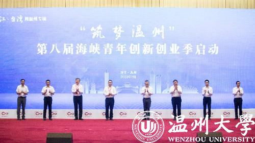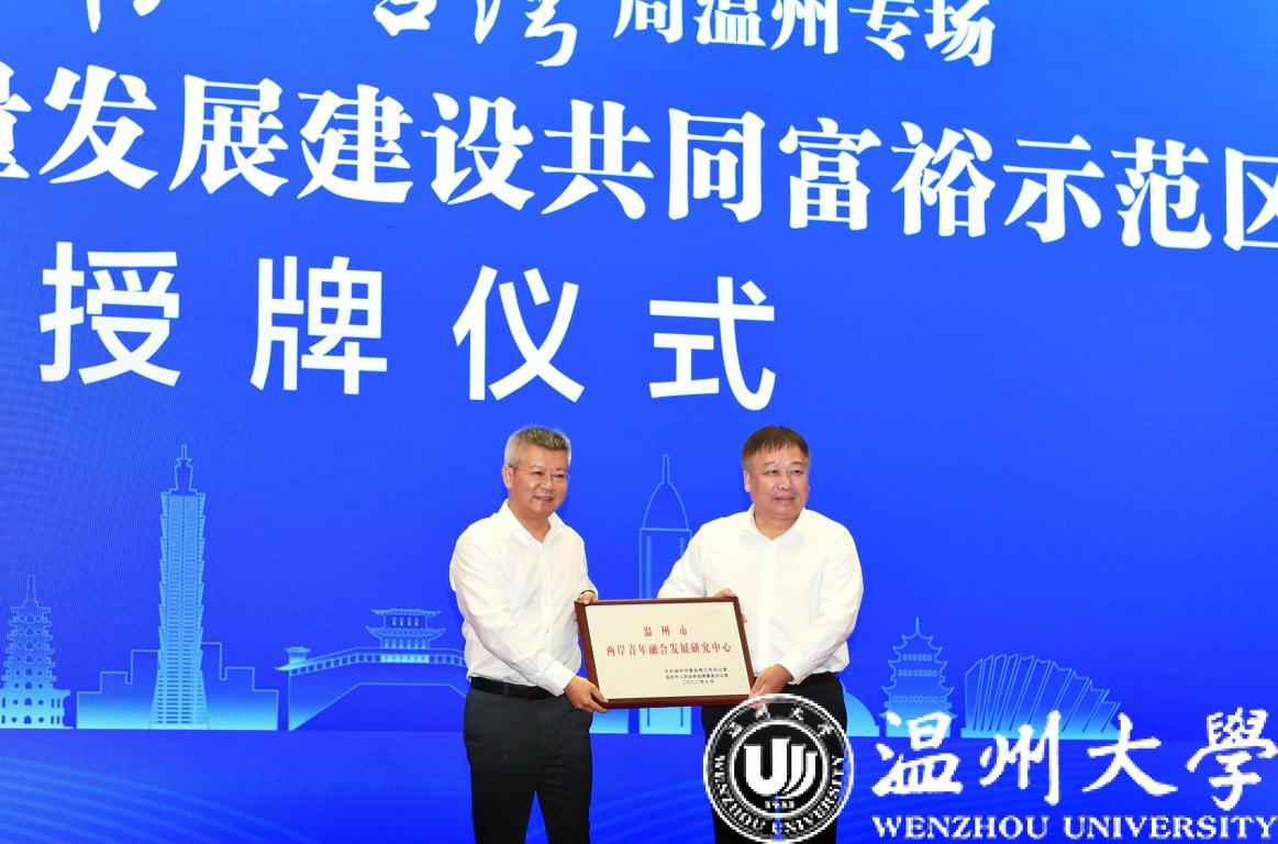 在“筑梦温州”海峡青年创新创业季启动仪式上,大会为小宝影院 两岸青年融合发展研究中心授牌,校长赵敏校长从温州市委常委、统战部部长汪驰手中接牌。